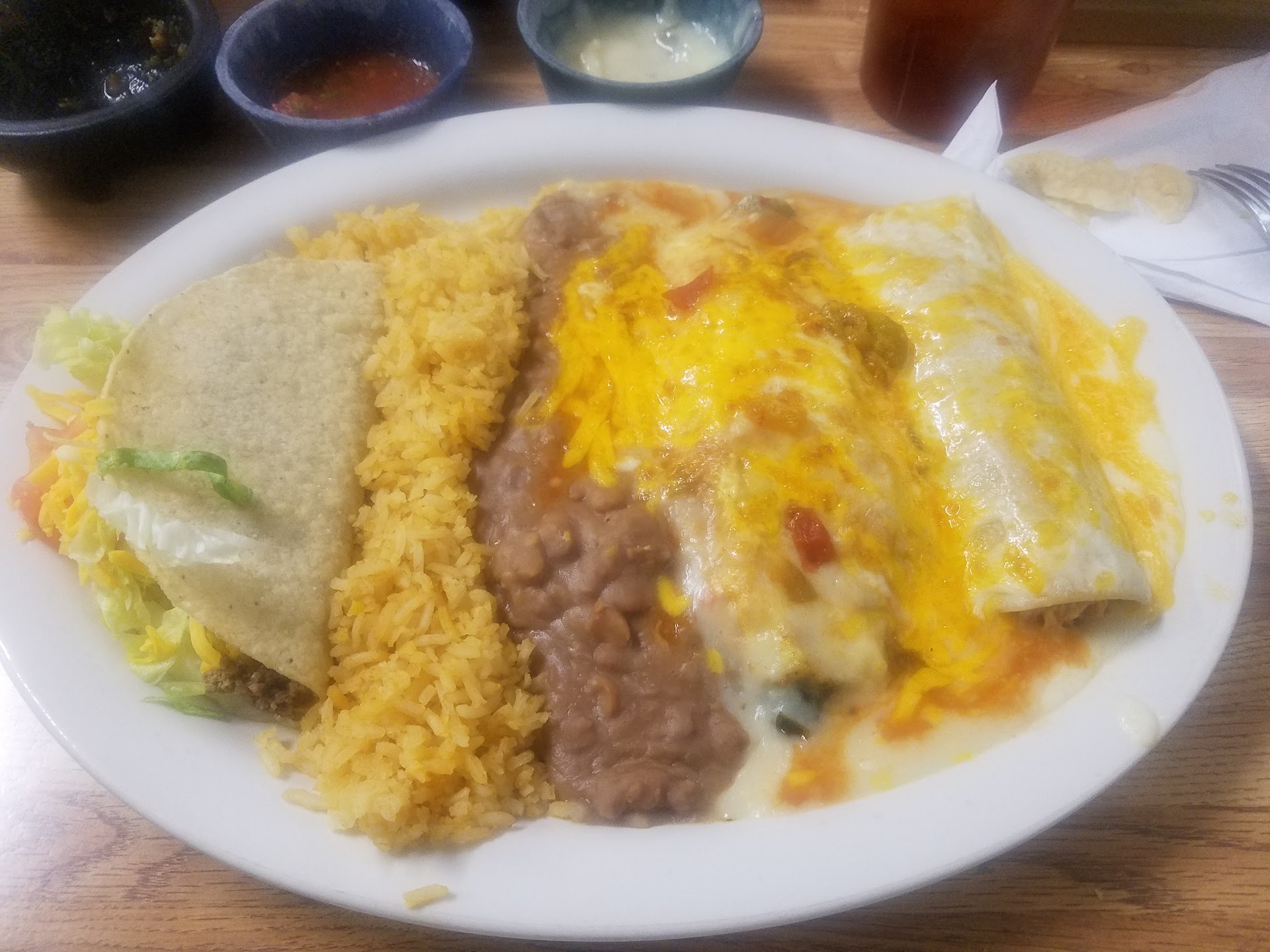 I was pleasantly surprised with this stop. The salsa was mild but had plenty of flavor. The hot salsa was not very hot but had an amazing roasty flavor. It was super tasty! The queso was my least favorite. It was not bad but just didn't stand out. I ordered (#14 if I remember correctly). Taco, Chile rellenos, enchilada. The taco was just a basic texmex taco. The enchilada had super moist chicken and a great flavor. The crema sauce was excellent. The shining star on my plate was the chile rellano. The peper had quite the kick! It was breaded just right, and there wasn't a seed in site. This was all the things I love about a chile rellano! Im not much of a sopapilla fan but I ate the entire thing. It was light and airy and amazing!