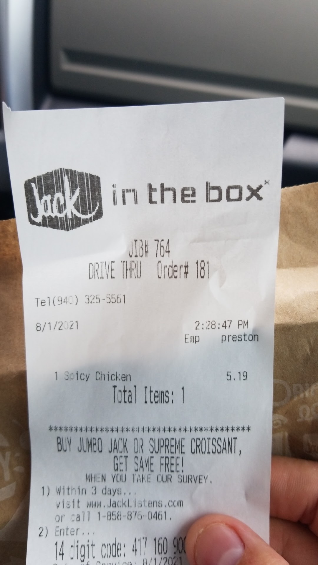 Wanted a simple Southwest Grilled Chicken Salad. No Salad were order because they don't have it. Looked up online quickly and found what I wanted, she took off and talking to other friend or someone at the door. Waited for 3 more minutes til she arrives. Told her I wanted Classic Buttery Jack, and were notified they were out of garlic butter... til I went ahead to order Classic Spicy Jack. Recieved soggy Tomatoes and cold food...