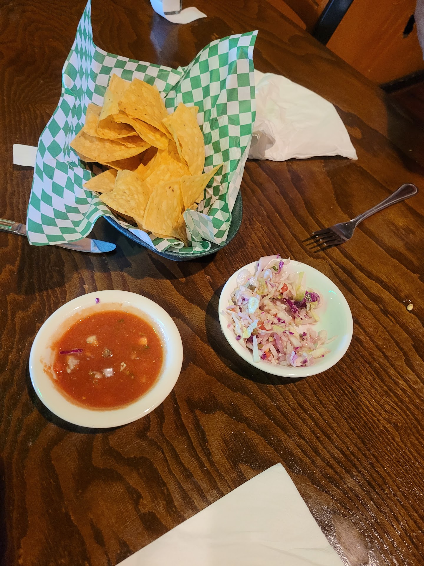 Read moreSeated immediately. Drink orders taken immediately. Margarita was outstanding. Unsweet tea was very good. Chips and salsa - chips are outstanding but the salsa tasted like tomato juice from a can with a small amount of spice and other finely chopped up ingredients. Did not care for it at all. From the very first taste I was disappointed. Also a bowl of shredded cabbage mix was served with the chips, never had any thing like it but wasn't impressed. Ordered chicken enchiladas with green sauce - chicken was tough and flavorless. The green sauce was ok. Beans and rice were good but nothing special. Buddy ordered pulled pork tacos and he loved them. Best he ever had. Waitress was very nice, checked on us frequently but not over bearing. Very nice and courteous. Family environment and clean. Would be nice if menu was written better. Everything is too vague and waitress had to...