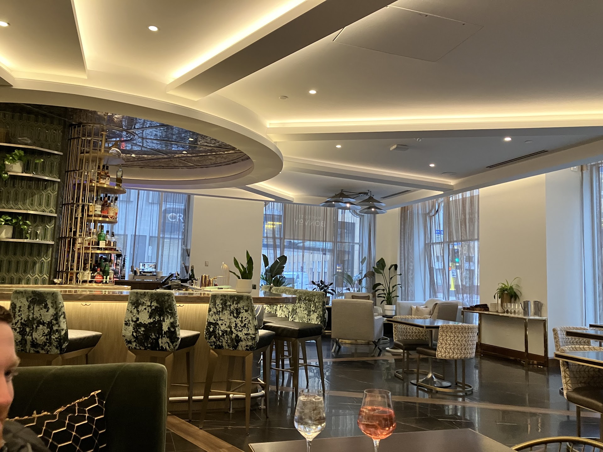 Vibe is great, itâs adorable in there with the swanky velvet furniture with quirky additions like the feet on the couches. Feels upscale, but not stiff. They also had French music playing. Oh, and the wallpaper in the bathroom was a Loons print!