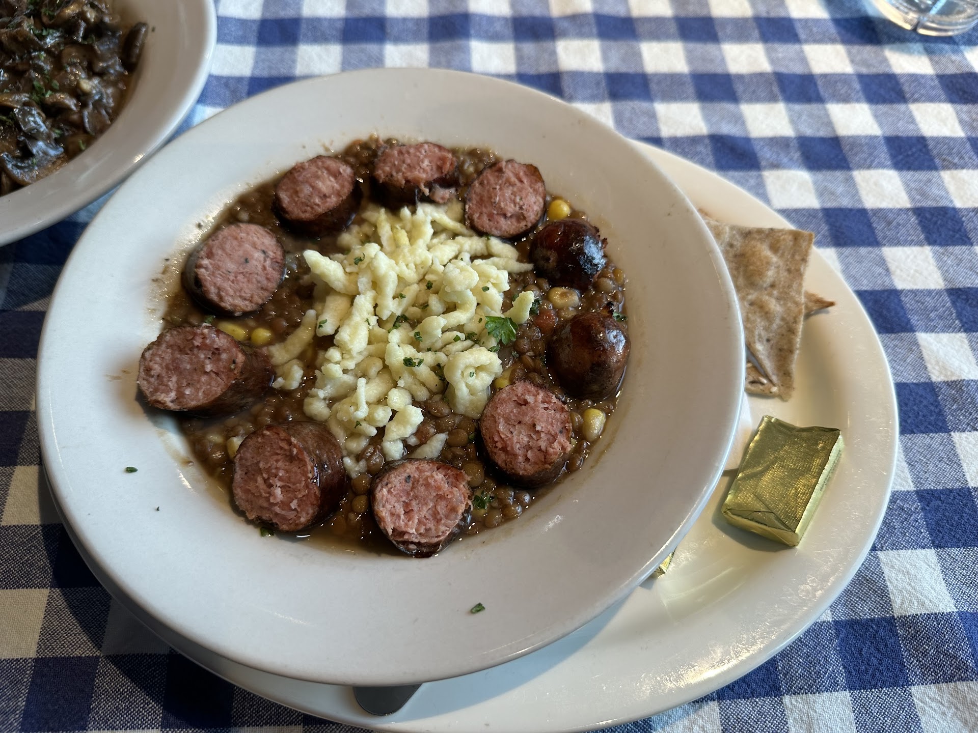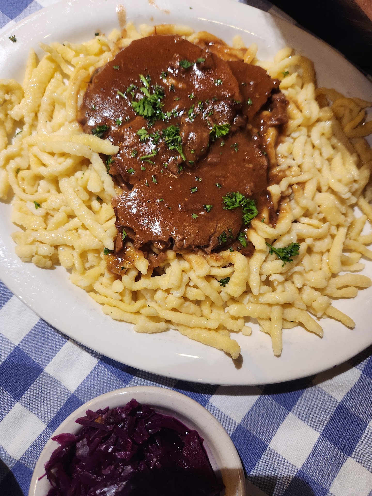 The dish was served with spaetzle, which seemed to be simply mixed with butter. Disappointingly, there was no traditional Rotkohl (red cabbage) to round out the meal, which is a hallmark of this dish.