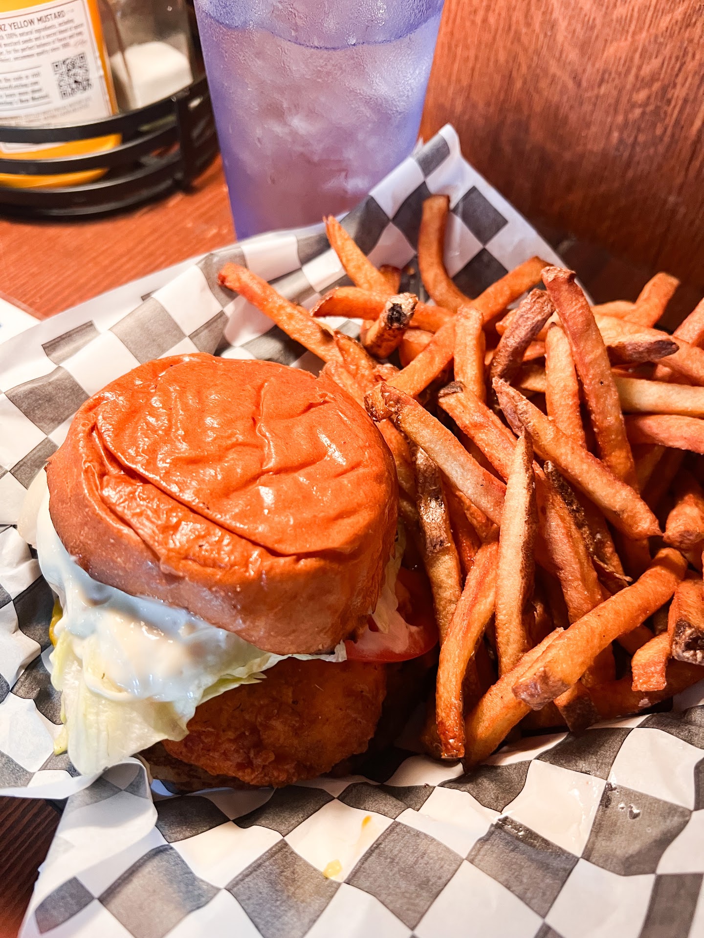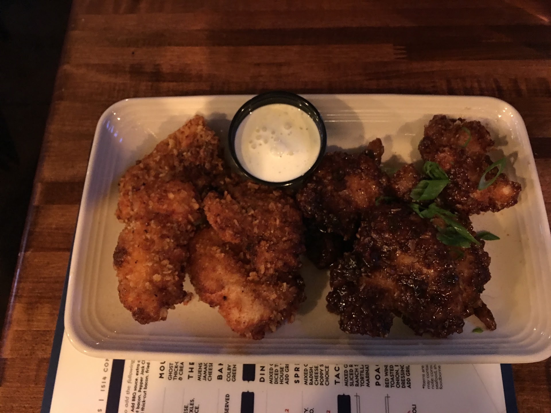 All that being said, it was solid bar food. I got the hot mother clucker (spicy chicken sandwich) with fries and strawbanero wings as an appetizer. Wings were fine. I feel like Buffalo would have been my preference. Needed more sauce but but husband liked them as is. Chicken sandwich was fine as well. I feel like a Blucy would have been the better option.