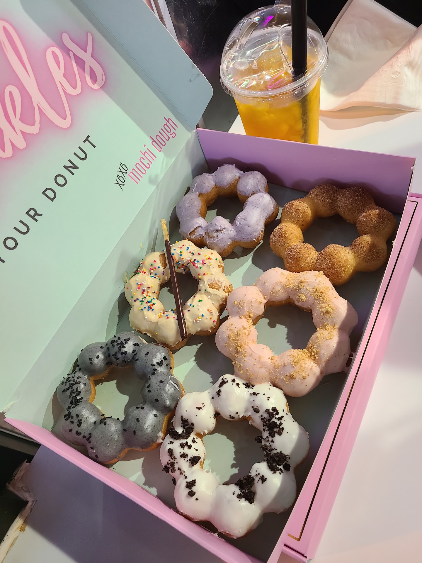 I really like the donuts. The sesame one we ordered were delicious. We were smart and got 25% sweetness in our milk tea. It was good. Theyâre new and they have operational hiccups I hope they fix it because I basically threw away $15. you can order a box of eight churro or funnel cake donuts. So I ordered the funnel cake ones that when we came up to the counter there were none available and they said we are making them right now and will get them to you. That was all completely fine and I even told the young woman We are not in a rush. Not 30 secs later sheâs pushing a steaming hot box at me that cake from the back and tells me not to close the box. Iâm pretty annoyed because I already know whatâs going to happen to these donuts the thing about fried food if you donât let them rest then theyâre just going to keep cooking each other. Itâs so crowded I donât get a chance to fly her down and ask for different donuts and I really regret taking that box home. Because sure enough what I brought home was basically sugar mush. I threw the whole thing away. Our other donuts which came in the mix box or a fantastic and it really was she should not have handed out super hot donuts crammed into a box. We also met the owner outside who asked us if we like them even though we havenât tried them yet and we had a small chat with him. I like supporting small businesses and we will return. I hope they help the worker not to stuff hot donuts in a box. But otherwise, it was...