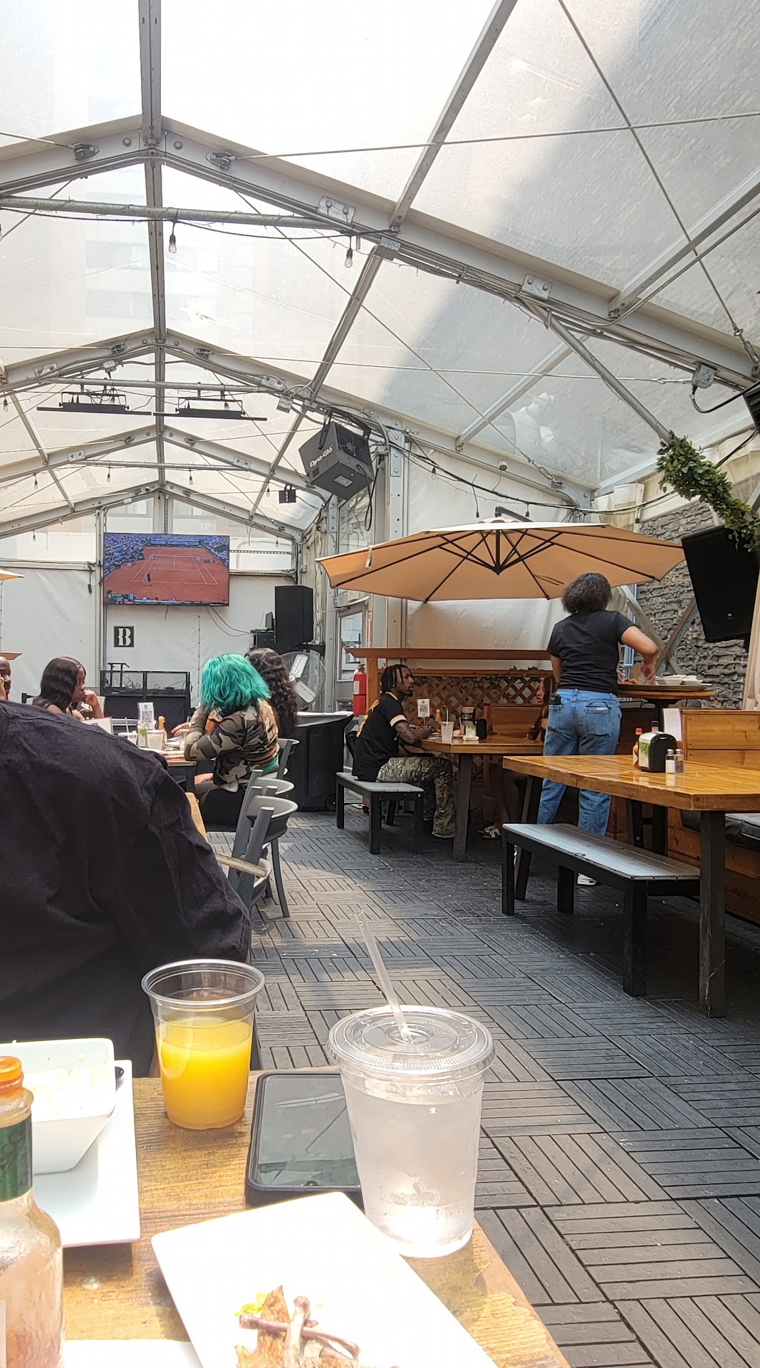 The patio was packed—the music was good, people were having a good time—but there was nowhere to sit. The bigger booths? Bottle service only—and they wanted $450 for that. If you’re not paying for a bottle, your only option is to stand around or hope a small picnic-style table opens up. We wanted to smoke hookah, but without a table, that wasn’t happening.