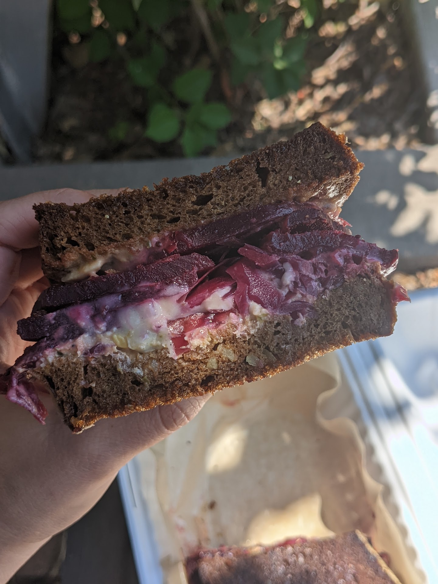 Read moreThis was a nice place to try out for lunch. I got the vegan Red Beet Reuben. I really enjoyed the bread, sauerkraut, and dressing. Beets are fine. I generally like all plant foods, but unfortunately beets are one that I really need to be in the mood for. The other vegan option was also beet-based. I'd really love it if they could make an option for vegans without beets. The grilled broccolini, zucchini, and pesto sandwich looks like it would be right up my alley! Unfortunately, to make it vegan the pesto would be removed, and would really put a damper on the flavor profile of the sandwich. I'd be so happy if they found a way to leave out the parmesan from the pesto, or to make another plant-based basil spread. Overall, I'm super appreciative of the vegan options, but just wish they weren't both...