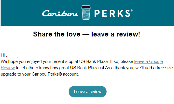 Read moreI am very disappointed with a software change Caribou has made to its cash register system. The staff can no longer tell me how many rewards points I have when I place and order. Staff told me the software only tells them if I qualify for a size upgrade or a free drink. Very disappointing. Also, I have switched to ordering my Matcha Lattes at Starbucks. Starbuck's goes not charge extra for alternate milks of oat milk, soy milk or coconut milk. Your Caribou Matcha Lattes are approximately 30 to 40 cents more...