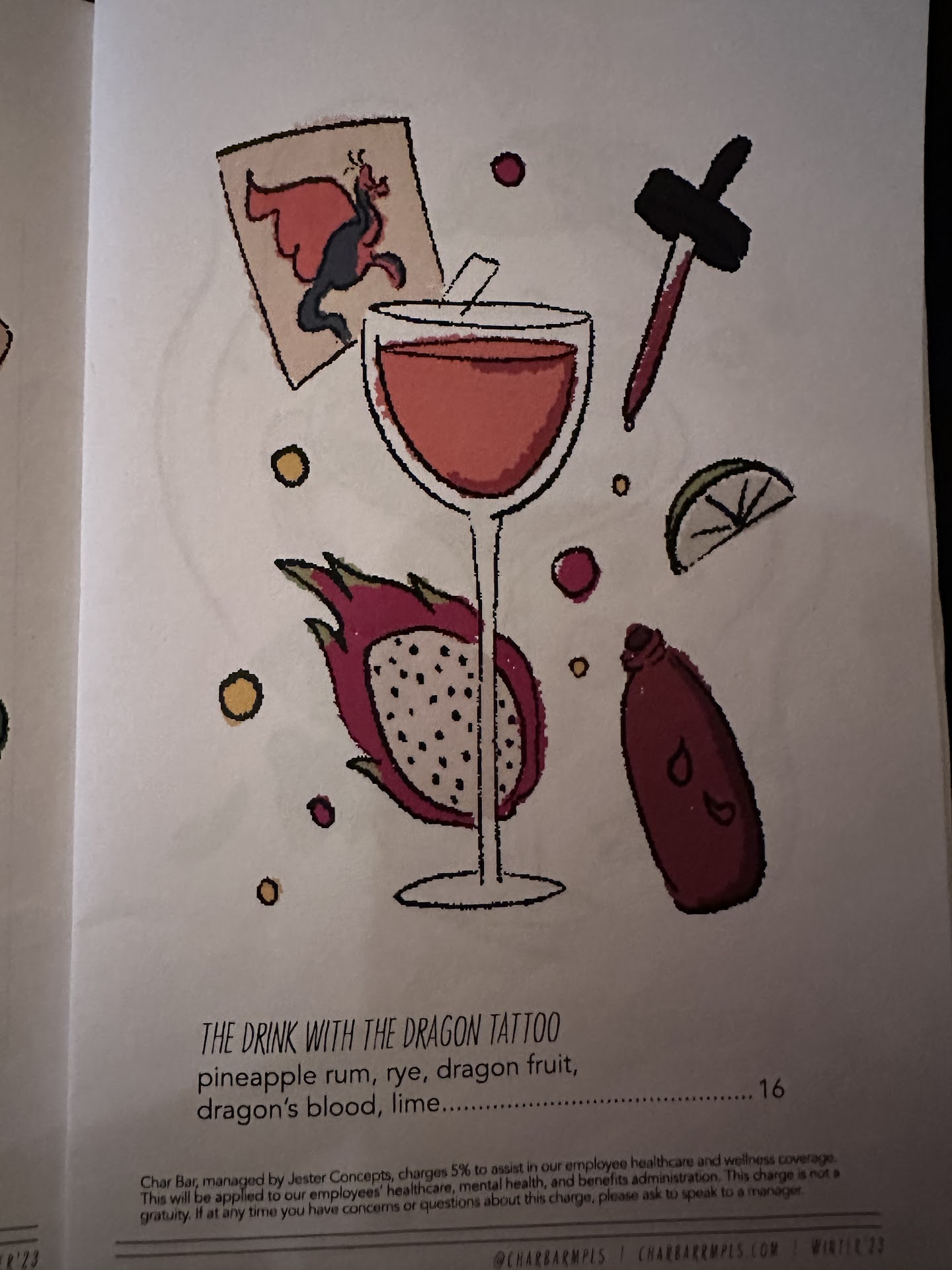 I had a dragon tattoo cocktail, serenity pineapple rum cocktail, and a frozen rum & cherry coke slushy. Drinks were boozy but pricey! Loved the menu showing the drinks very cute and visibly pleasing.