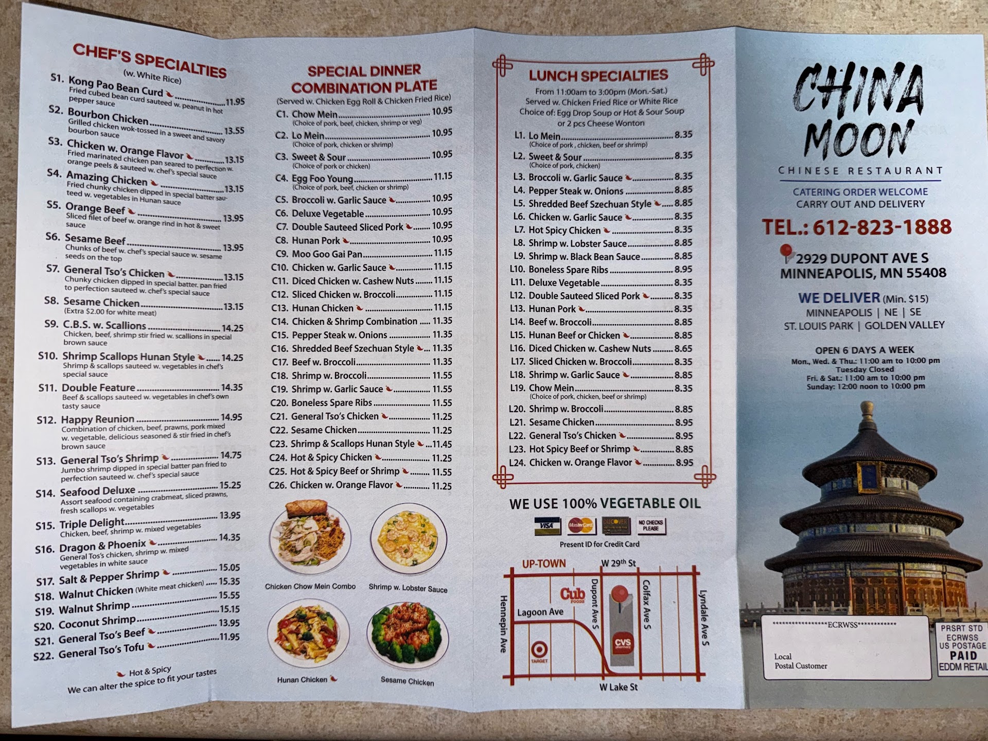 Read moreThis is my first time writing a review for ANYTHING, but I felt this was important. My place of work has regularly ordered take-out from here for years and have really loved the service/food. I personally have never thought their lunch specials were anything to write home about, but their steamed pork dumplings are phenomenal... until recently. They have completely changed their dumplings and now they are comparable to the kind you can get frozen at the grocery store. The look, the taste, and ingredients have all changed without warning. We also normally get a free entree because we order so much, and this time the free entree was Sesame Chicken. It was TERRIBLE. By far the worst Sesame Chicken I have tried. Today we will be ordering Chinese from a new place and I am very much looking forward to it :) If you consider ordering from China Moon, proceed...