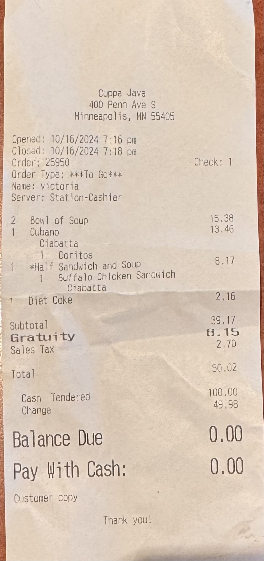 After my meeting on my way back across town I stopped back in for some weekly wrap up emails and lunch. I went for the Tuna Melt which seems overpriced at $10 (though I'm sure rent is plenty hefty in this location). Open-face style with plenty of cheese, chips, and a pickle. For $10 I might have expected more substantial albacore tuna instead of the typical chunk light tuna. A lighter option at a lower price wouldn't be a bad idea, but I get the economics.