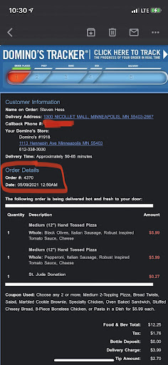 Tracker showed my pizza was being made. Said it would take an hour to get pizza. Hour and a half rolls by - no communication. No text. No email. (No, it wasnât in my spam folder), and no call, and I couldnât call them because by that time, they were closed. Awesome, so now my money has been jacked, and Iâm starving and literally had no way of communication at all as you can see in the pictures I couldnât even report an issue (notice the time on the pictures.)