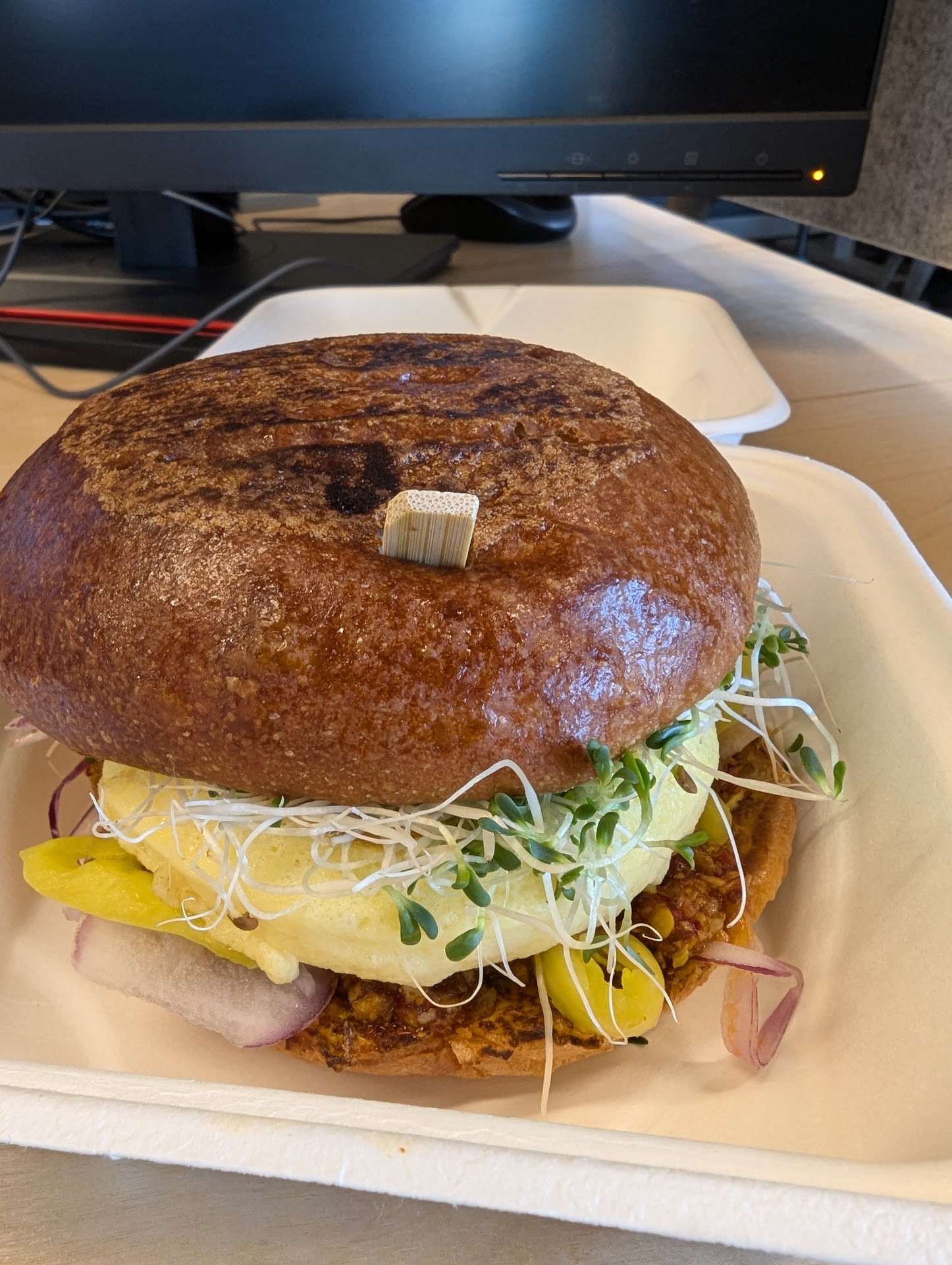 I get my sandwich and open the box. WHAT. This thing is beautiful! They have no right to be having PRESENTATION at this joint. It was only 9 bucks (ok I know breakfast sandos should be like 5 bucks but that was the before times)! Well I go ahead and bite in. All I can say is this sandwich is excellence. Egg has the perfect consistency and the softness is complemented by the crunch of the chilli. The garam masala spread adds flavor without oozing all over the place and falling everywhere (I think sandwiches that have too much spread are gross and rely on the spread to cover up bad ingredients). The brioche bun is perfect, sweet and lightly toasted. The sprouts, onions, and radishes add a nice freshness. And the chorizo is just great. Just wow. The size is perfect for biting - no straining or trying to catch falling bits. Each bite contains the correct ratio of ingredients - no slipping or sliding. WELL DONE LADS...