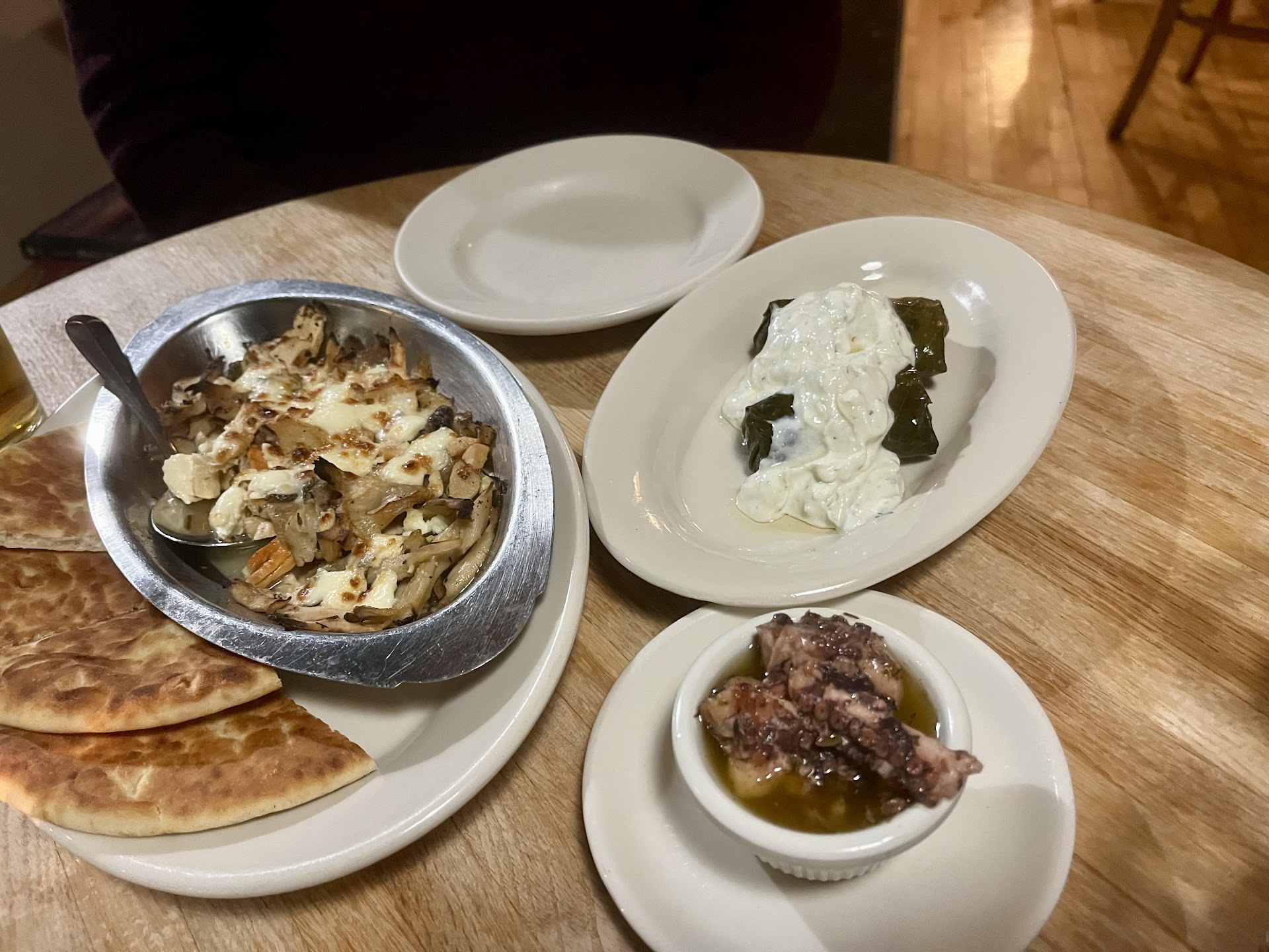 The saganaki was bland and the few small pieces were lost in a sea of mushrooms. It came with pita-which was pillowy, soft and warm-but trying to top a pita with the scattered pieces was awkward.