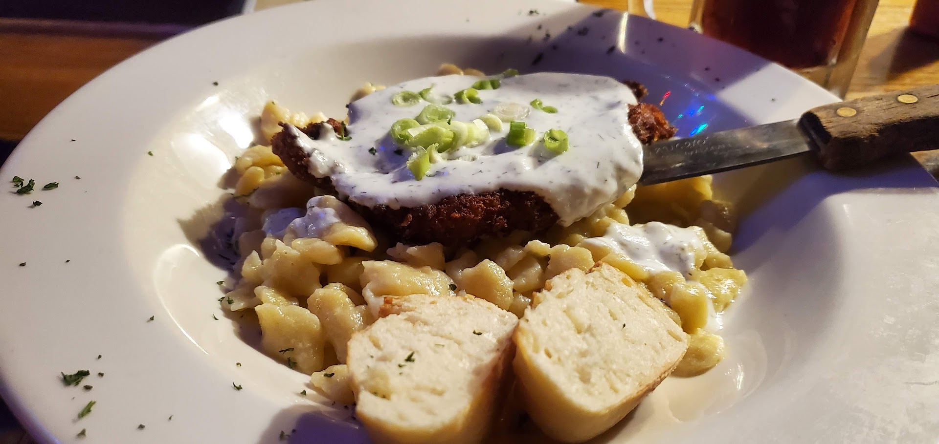 Food came in REALLY fast. I ordered the schnitzel and it was TERRIBLY bland sand dry. The white sauce was watered down and was not like a gravy at all. What I thought were noodles were grainy like they were precooked and rewarmed. I was really looking forward to revisiting German cuisine... I should have gone for the currywurst.