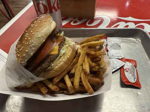 Per my receipt, my order was placed at 6:39pm. Ordered the double burger combo, $21.45 after tax with fries and a pop. The guy working the counter (owner?) said it'd be 20-25 minutes for the food, and there was a 7 top waiting for their food still ahead of me. Only one other guy waiting for food when I walked in. OK, no biggie.