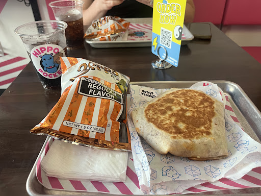 I was in the area to go to Turtle Bread and noticed it while parking and looked it up. I ordered ahead while in Turtle Bread and had a bit of a wait once I was done there, though thats fair considering they said 20 minutes and I was there in about 5. The interior is really nice with a fun retro vibe and contactless ordering screens, as well as a wall of old cell phones and really good music. The staff was really nice and my food was ready sooner than expected. I got the Hip Griddle, and it did not disappoint. I drove home with it and it was still piping hot with melty cheese when I got home. It was nice and crispy, and the smell was Beagle-Approved (though he did not get a bite due to the likely garlic or onions in the sausage). I was pleasantly surprised to find a cute hippo sugar cookie, which was nice and tender and not too sweet. As for the pocket, it took me a few bites to get to the egg, and I didn't pick up any heat from the maple hot sauce, but it was really good. I usually dont like fried eggs, but I really liked this and it made a good brunch. In all, it ran me $10.90 ($8 pocket, $2 chocolate milk, and tax), and I would say it was...