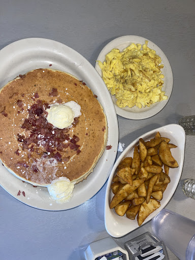 Ā Ā Ā Read moreI donāt remember how this place ended up on my saved āWant To Goā lists, but Iāve must of seen someone post it and it looked good. Sunday I happened to be nearby looking for food and decided to stop by cause I LOVE breakfast at anytime. Upon walking in I was greeted by an all female staff (except the cooks) I think and they were friendly. I was riding solo so they sat me right at the bar in the front. My first impression was the decor was waaaay to busy, literally decorations everywhere, all walls, ceilings, ledges, etc. Very eccentric but that is probably the vibe they are going for and what draws people here. The menu has lots to chose from which is a good thing, except regular French toast which was disappointing. I ordered the apple bacon bits pancakes, scrambled eggs and breakfast potatoes. The pancakes were fluffy and covered the entire plate and tasty. The potatoes were crispy and seasoned well. The scrambled eggs over cooked and bland. Overall 4/5 for the breakfast. All the sides are a la carte ($2-$5 each) which adds up quickly in these types of establishments. Even being seated next to all the waitresses it still took a WHILE to just get water refills, my waitress was pretty popular and had alot of regulars. Overall a good breakfast meal, ran me about $22 without getting a drink. I was so full from the short stack pancakes I had to take a cat nap in my car lol. I would visit again with friends so I can try more of the menu and have mimosaās.