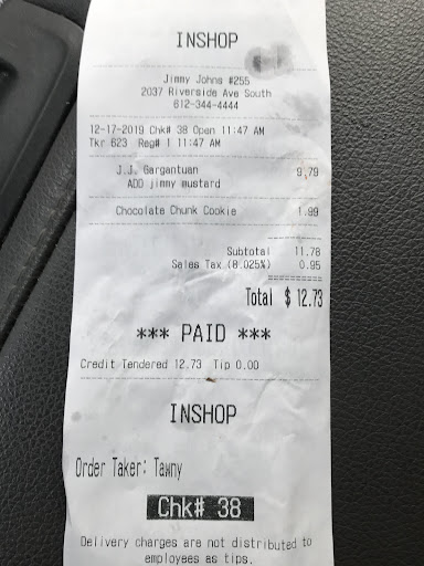 Read moreThis particular Jimmy John's has been a life saver for me while working at UMN. We have very limited options on the West Bank for something quick to stop in a pick up to take back to the office. I'm glad JJs is one of them.