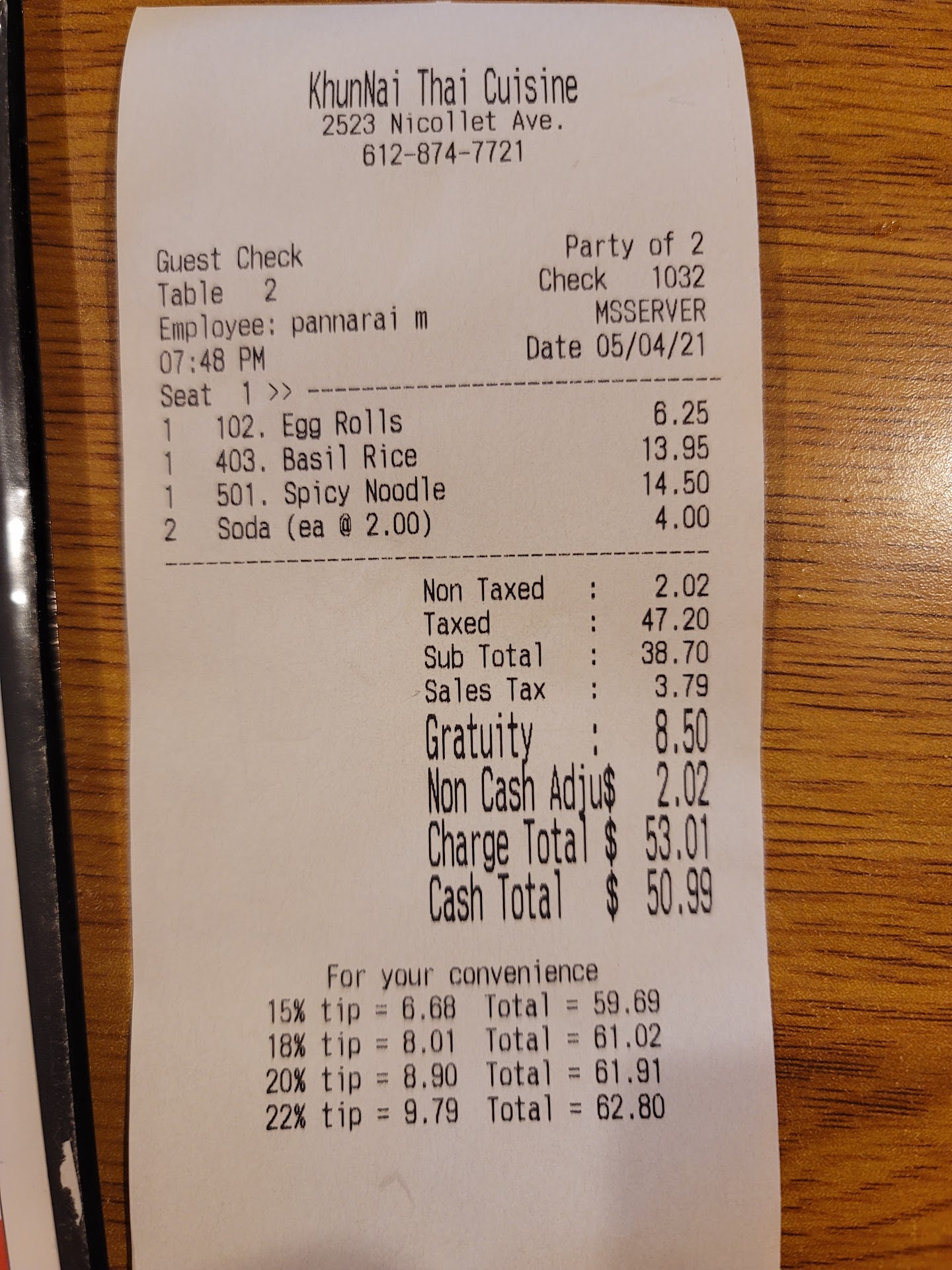 Read moreThe food was okay. I ordered the combo fried rice and the shrimp spicy rice noodles. The problem was the bill. My total for food and drinks was $38.70 and with 8.1% tax (I think that's what Minneapolis tax is) it should have been $41.84. Well, I noticed they charged 20% gratuity which was an additional $8.50. Also, I noticed there was another charge for $2.02 that stated "non taxed", then there was another charge that stated "charge total" which was a fee for using your credit card. When I asked the server why there were those extra charges she said that "gratitude is automatically charged because of COVID and you get taxed on the gratitude charge because the owner does not give the servers that "gratitude" charge to them as tips, that gratitude is for the restaurant. Well on top of all of that, we were asked and expected to still leave what is considered a "tip" that will then go to the server and you will not be taxed for. They suggested the tip amount at the bottom of the receipt based of the grand total after all those extra charges. This was a bad service in my opinion and seems like scam to charge all those additional amounts and still get taxed. Seems fishy and illegal. I hope this gets to the right authorities and gets revised. I never have a problem paying for a service and specially when it comes to tips, but when I see stuff like on my bill, it...