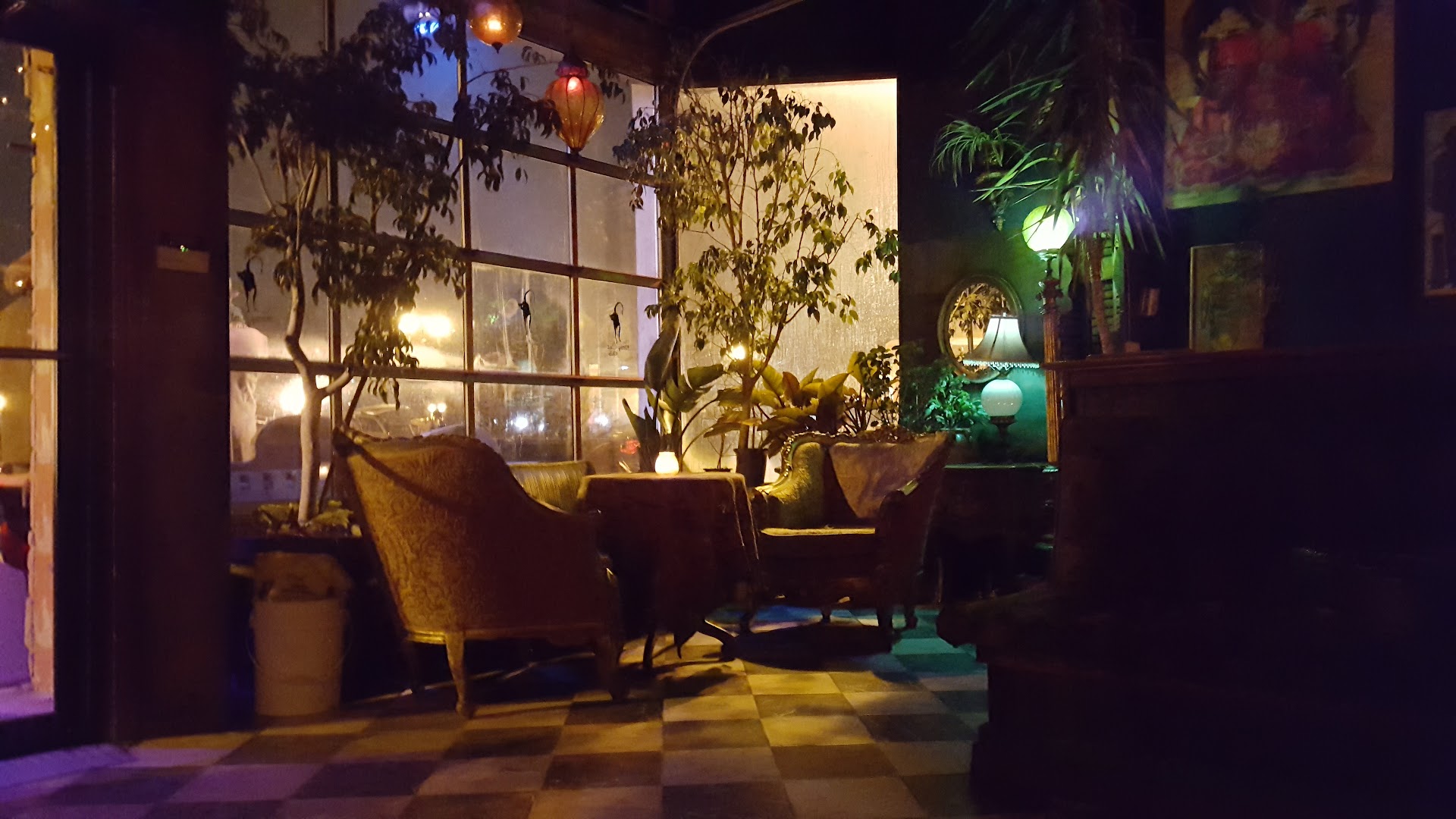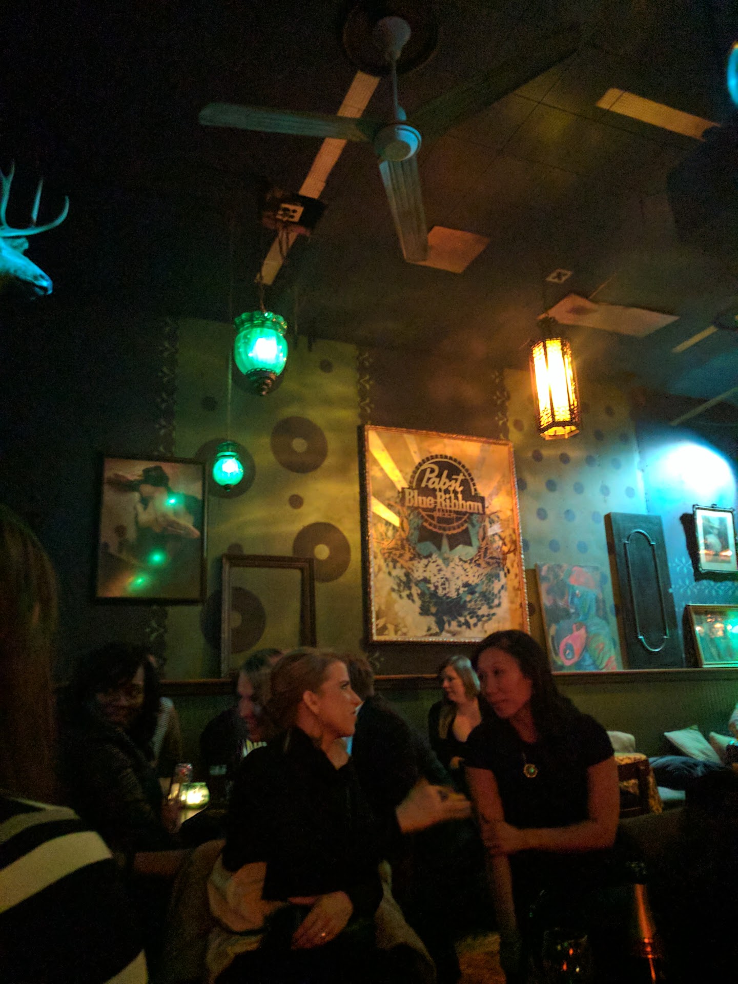 I love the atmosphere. The lighting is dim and colorful. There are colored light bulbs everywhere. There is random artwork all over the walls, the bar is wood with melted candle wax all over it.