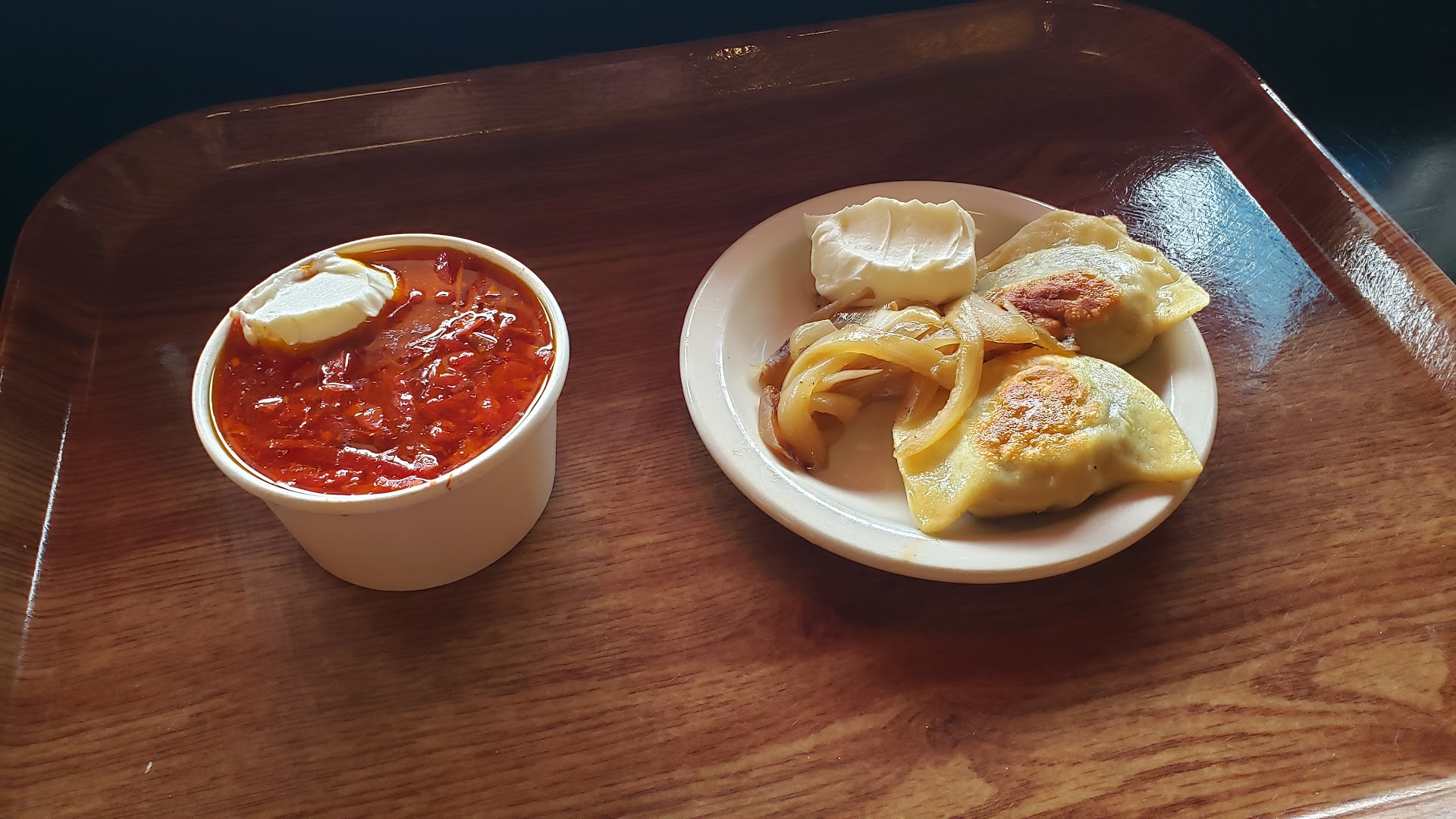 I ordered a cup of borscht and two meat pierogi. The soup was mainly broth with a small amount of beets or cabbage (I couldnât tell) and two very small pieces of meat. It was also a bit oily, but I read this could be from the meat cooking in the broth so I didnât really mind this much. The pierogi had potential as the meat seemed flavorful but they were served below room temperature (borderline cold). I was confused how this could be the case as the line was moving fairly fast and I saw them on the flat top cooking too. They also seemed a bit old or rubbery as if they had been sitting around for a while. This was a big letdown as I was really looking forward to trying these here.