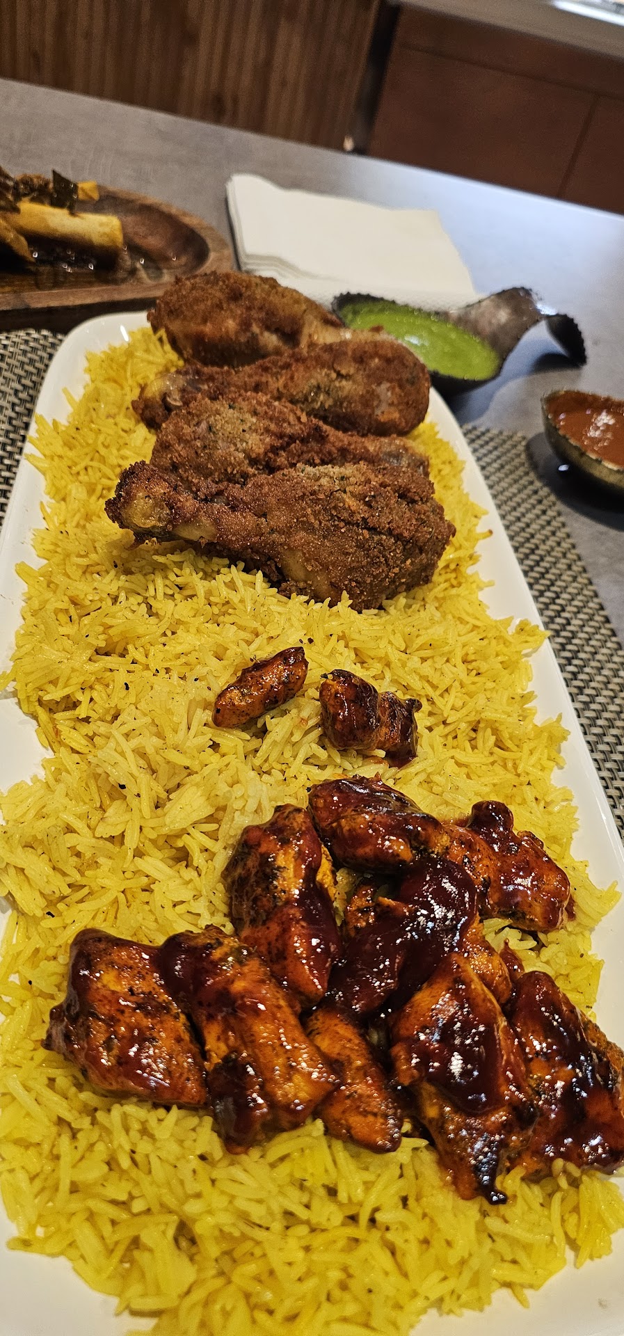 From the festive tropical vibes of a refreshing pineapple drink to the delightful spread of culinary treats, this dining experience is nothing short of exceptional. Kicking off with a beautifully hollowed-out pineapple, complete with a fun straw and an umbrella, the mood is set for an evening of gastronomic indulgence. The main courses are a parade of flavors, featuring perfectly seasoned chicken that falls off the bone, embraced by a bed of vibrant yellow rice that promises to be a feast for both the eyes and the palate. The crispy, golden fried chicken alongside the tantalizing barbecue chicken pieces speaks volumes about the kitchen's attention to both taste and texture.