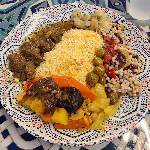 We began with a sampler of Mediterranean salads: spicy cauliflower, roasted beets, marinated peppers, and more, served with toasted baguette. Each dish was fresh, flavorful, and meticulously prepared, and the variety kept everyone at the table engaged. For our main courses, we chose the lamb shank tagine, chicken tagine, and beef couscous. The lamb shank stood out as especially memorable—tender, deeply seasoned, and exceptionally satisfying. The chicken tagine featured preserved lemon, olives, and aromatic turmeric rice, perfectly balancing brightness and warmth. The beef couscous was hearty and comforting, with generous portions and rich flavor.