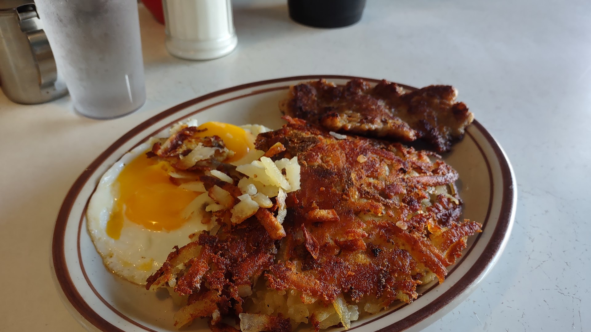 The hash browns were as amazing as the articles you read about. My wife said that they appeared to be freshly shredded! The pancake was equally enjoyable! My wife went on and on with her praise about the pancake - and I was in complete agreement! In the end, we "tapped out" with a tiny bit of hash browns left over (just not enough to take home) and were both comfortably satisfied (if not even a bit "full").