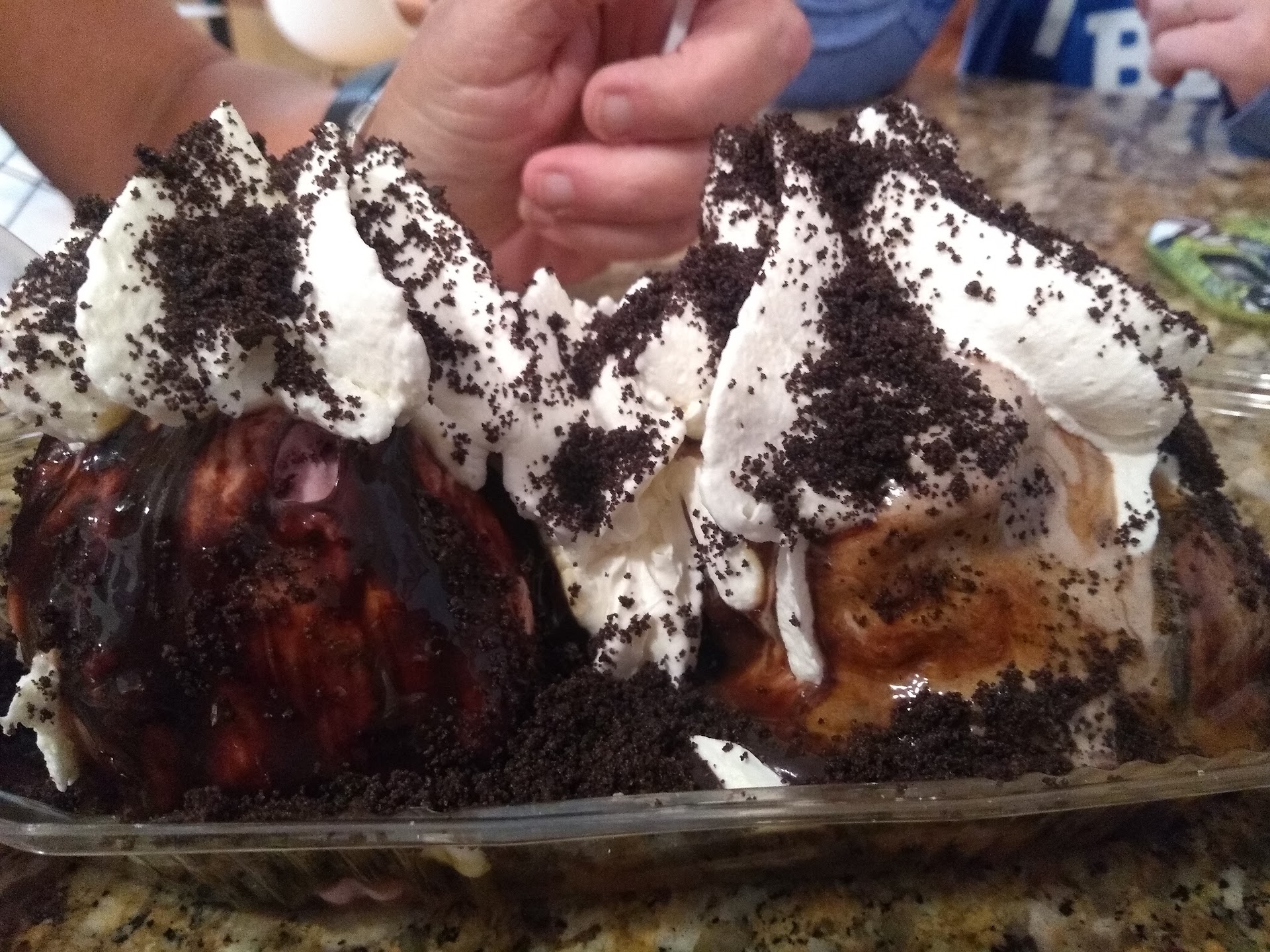 The portion size for the talking oreo seemed like half the size or smaller than it was years ago but priced the same if not higher. In the picture I had of it from years ago, it was served in a larger cup, not the smallest size, and I remember it had lots of hot fudge inside surrounding a good portion of icecream with crushed oreos. On this visit there was MAYBE a teaspoon of hot fudge in the small cup around the small scoop of ice cream that didn't even fill the cup but it was loaded up with whipped cream.