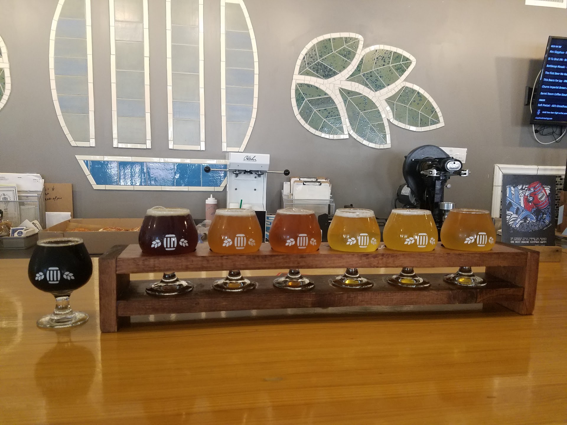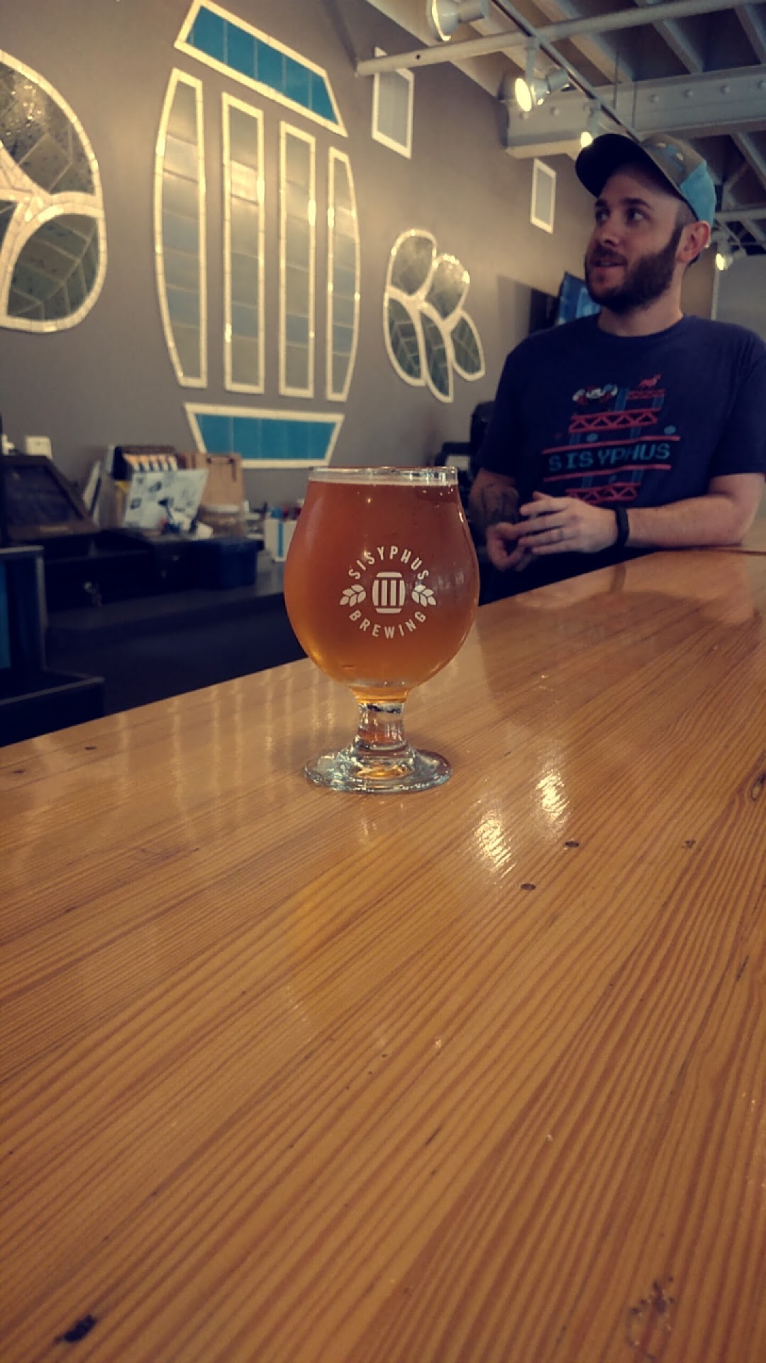 Ā Ā Ā Read moreThis is a review for the overall experience here, not simply for their beer. The full "taproom" experience is incredible- you've got great people behind the bar (Here's looking at you Alvin, you dog whisperer), great patrons alongside you, an awesome and totally chill space that is never full, its DOG friendly!!!!!, and of course they are pouring some good beers out of their taps. They have a second space adjacent that is a comedy club, and it seems to be happening over there. If you want to chill out and relax on your own, arrive around 7:50/8:10, as the comedy gets going at 8 and the main taproom thins out. But, if you're feeling social the patrons and barkeeps are all friendly folk and are happy to have a conversation. Every time I've been here I've felt welcome and comfortable, and that my business is appreciated. This goes really far in my book, there are some great people running this place. And, lets not forget the reason we come here, to drink some good brews. There is literally something for everyone on their taplist. It's so good to see a brewery doing a wide range of beer, especially so in this age of extreme specialization. Not here at Sisyphus (badass name by the way, these folks must have been humanities majors!!!), no here if you want a traditional German Marzen, you've got it. Feeling trendy? They've got you covered with milkshake IPA's (definitely not my thing, but maybe it's yours?), they even have Belgians (my personal favorite) and this is admirable because as a brewer myself I know how much space and time these beers take up in the brewhouse. Way to go Sisyphus for having saisons and dubbels on tap for us!!!! If you've read this far you get the idea that this place is special. Just stop reading and head to Sisyphus and experience it...
