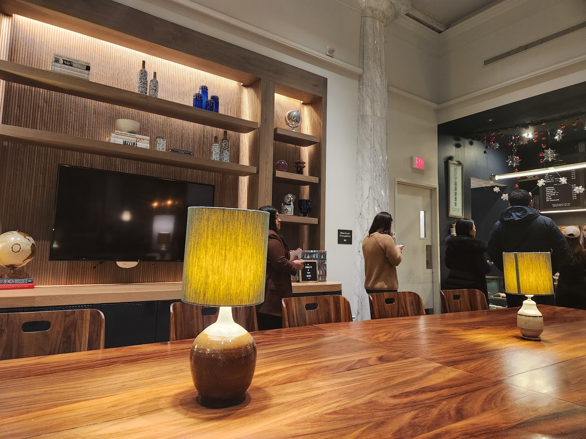 The Greco-Roman pillars add unique character combined with a fire place in the middle of the seating area. Not meaning to sound facetious, but the built in bookshelves near the barista counter are missing an antique typewriter or two!