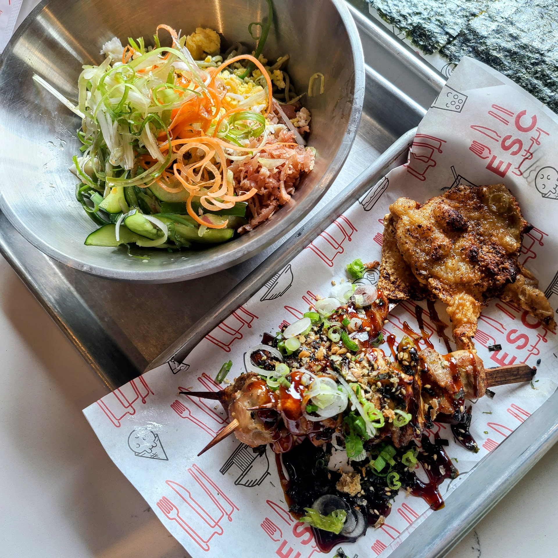• Oboreta Dango (Drowned Dumplings) - Pan fried gyoza layered with their signature house sauce, spicy chili crisp, sesame oil, topped with crispy onion, crispy garlic furikake and shredded fried potatoes.