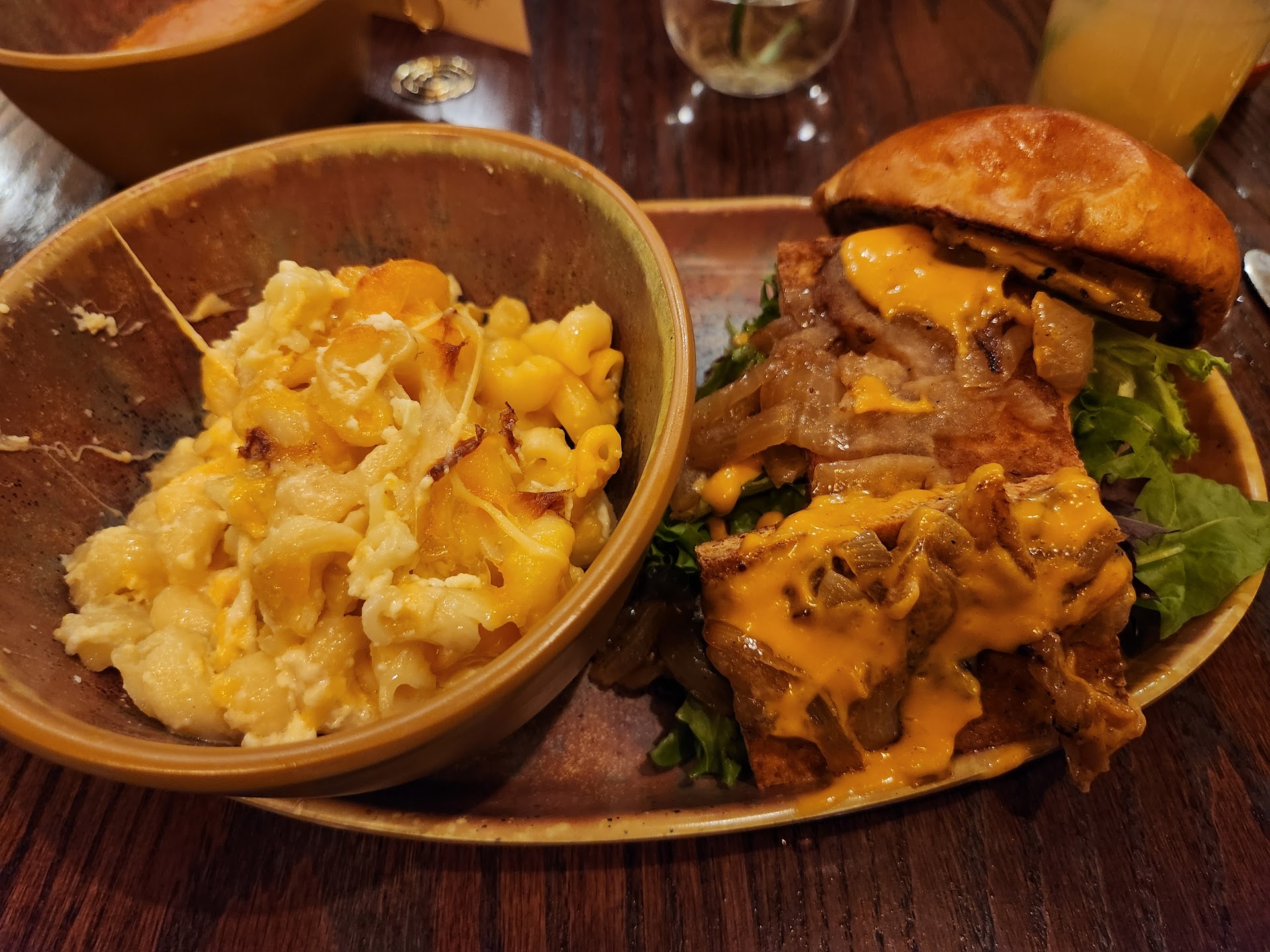 I came to âTap Inâ on July 15th in the evening time with my sister. First, we walked in and werenât greeted and waited for 10 minutes, it seemed like everyone working there purposely wasnât making eye contact. Finally I had to asked someone who worked there if we were supposed to seat ourselves and he told me someone would be with us shortly, we waited another 10 minutes. We were finally seated and we gave the waiter our order. We got two drinks, the salmon burger, the veggie burger, and the chicken sandwich, we got mac and cheese, brussel sprouts, and greens. It took about 20 minutes for our drinks to come out, which were terrible btw, and werenât ever asked again if we wanted anything else, and we waited over an hour for our food. Waiting was like torture, they had someone playing music in there and it was louder than any concert or show Iâve ever gone to, and I go to dj events often. We were sitting at a small circle table and I had to have my sister repeat what she said over 5 times and I still couldnât hear her, it was TERRIBLE. We finally got our food after about an hr and 15 minutes of waiting and the salmon burger was our âsaving graceâ definitely the only thing that was good. Both the veggie and chicken sandwich buns were completely soaked and soggy, and both the chicken and veggie patties were extremely dry. The Mac and cheese was alright I guess, and the greens and brussel sprouts had no flavor at all. We left almost all our food, and our drinks. Definitely one of the worst dining experiences I have had.