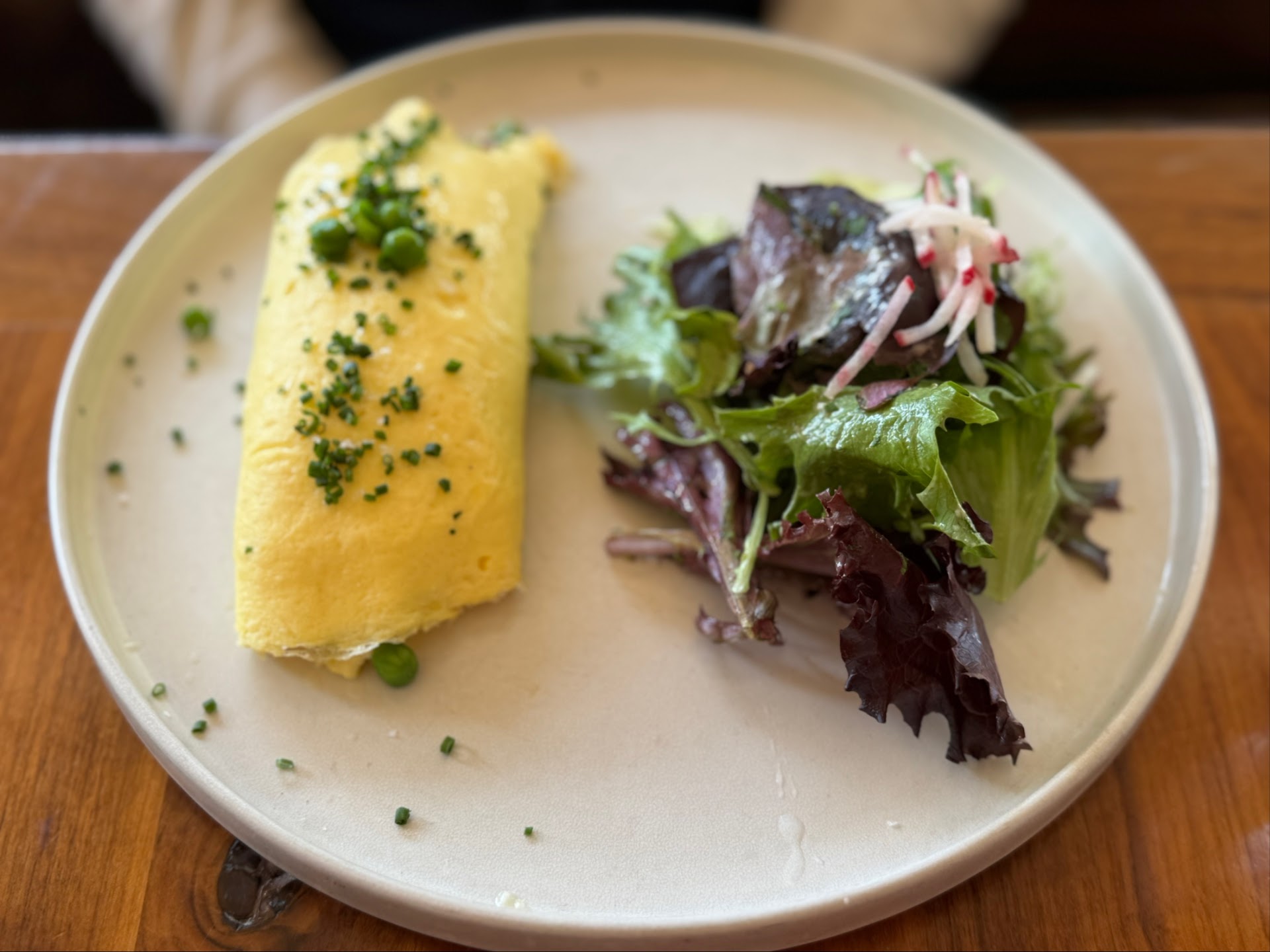 On a more positive note, the French omelette was made in the French style and was delicious. In particular, it was made with fresh peas! We ordered it with muenster cheese—a substitution we requested in place of chèvre (a bit too goaty for my wife). It stood out as the most successful plate of the morning.