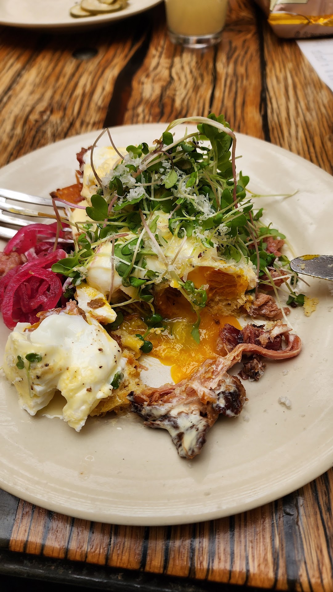 I have eaten here couple times and thr good is great. Love the farm to table food. I am a big person on fresh quality and not prepackaged foods and this place is amazing for the food. Both times I was there around brunch on a Saturday and the breakfast menu was really good both times. I got a breakfast bowl with carnitas meat and it was amazing. Lots of flavor, texture, color in the bowl from crispy potatoes to delicious carnitas to a smooth and silky and cooked perfectly. The pickled stuff in it was different and a great contrast to the other parts. The micro greens are a current favorite to added nutritional boost and getting these on both plates here was awesome. The bowl was a lot of food added meat made it right amount for me, the added meat not necessary but highly recommend. The eggs benedict was a different take. It is one of my favorite breakfast menu items. This take I could appreciate the concept but it was a 4 star for me. I really liked the cornbread that you can tell is fres and made in house if not at least near by. That was a great variant that I may have to acquire when I make it at home. The ham was delicious, it said maple cured and we use only pure at home no maple flavored but the maple flavor I was hoping for more of a pop from, maybe using a little maple syrup in the hollandaise sauce? Anyway the eggs were perfect and topped with micro greens as well. The hollandaise was, well not enough, or jot enough of a flavor, it was minimal and really felt like an after thought rather than a main focus which when ordering a Benedict the 3 things are required, a great hollandaise that is fore front, a take on ham, and a base. They had 2 of 3 spot on. Thus I would say 4 out of 5 for it great meal still don't get me wrong but could have used a touch more hollandaise with a bit more of a flavor or focus on that aspect. Great place will be back. Also like how they jave some fresh produce, baked goods, and farm fresh meats in...