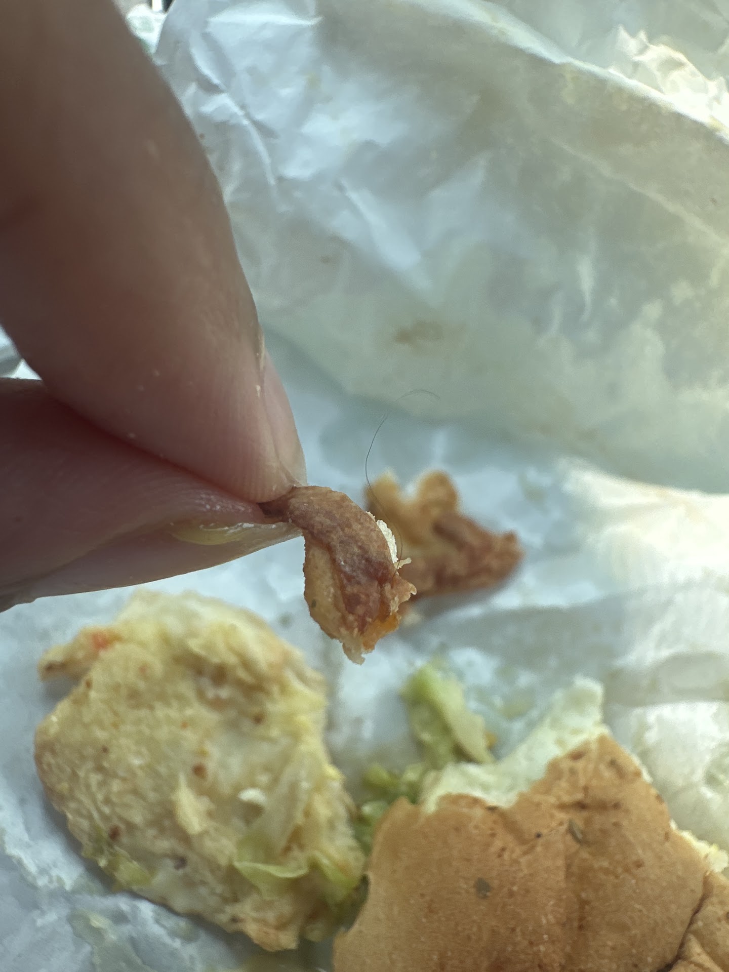 So first of all I’ve come here before and I was served black olives with HUGE seeds in them. I could have easily broke a tooth the seeds were so hard. Now I come back ( and watched very close making sure their was no seeds in the olives) in again and the man I ordered from was clearly irritated which was fine but when I left he was staring at me like he had no common sense. Usually I flinch at people with staring problems or I stare back but I didn’t have energy for that today. THEN while almost done with my sandwich I notice a hair BAKED into the bread and in then noticed there was a thick hair in the sandwich as well!!!!!!! When I saw The hair that was in the sandwich I threw it all away. I came back and decided I should post pictures. The thick hair in the sandwich I couldn’t find again. But the ones baked in I just ripped from the top of the bread for the pictures. I feel like the man put his hair in the sandwich on purpose and I’m glad I saw it before biting the last bit of it. Praying he didn’t put any others in it that I didn’t see.. I look at my food as I eat so I doubt it. And I won’t be back. The man was older. Maybe early or mid 50s, on the bigger side and...
