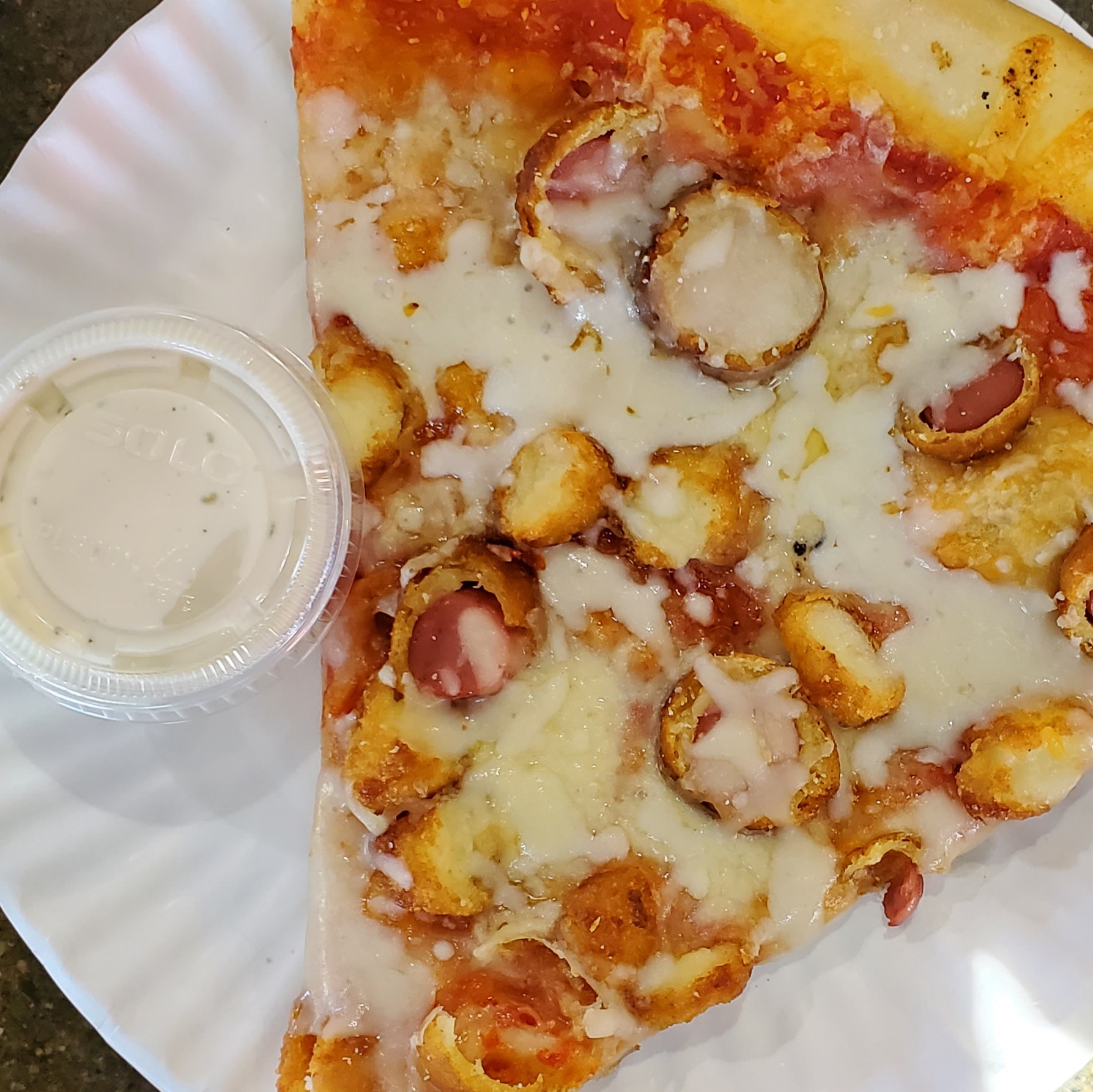 Got the 6 inch Taco Grinder (warm), which I almost forgot to take a picture of it. That was damn good with the sauces. Taco Meat is kid friendly and mad like Grandma's. 2 slices one PBR (pickle bacon ranch), and the other was a taco slice. With red grinder (spicy yet mild hot sauce) and white grinder sauce which I would recommend, it is made like a more cheesy less ranch peppercorn style. These are thier two popular choices. Besides the Pizza of month which changes.