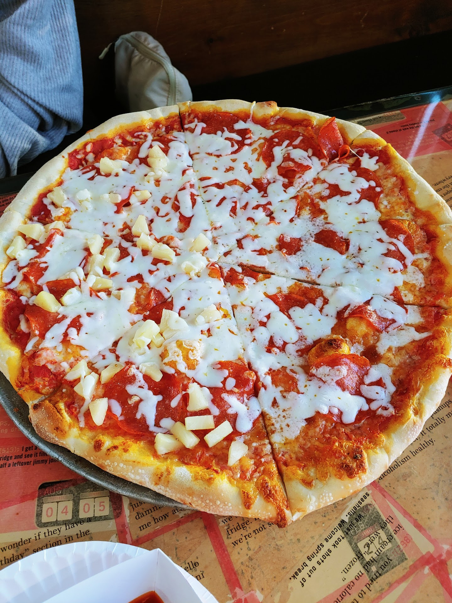 Got the 6 inch Taco Grinder (warm), which I almost forgot to take a picture of it. That was damn good with the sauces. Taco Meat is kid friendly and mad like Grandma's. 2 slices one PBR (pickle bacon ranch), and the other was a taco slice. With red grinder (spicy yet mild hot sauce) and white grinder sauce which I would recommend, it is made like a more cheesy less ranch peppercorn style. These are thier two popular choices. Besides the Pizza of month which changes.