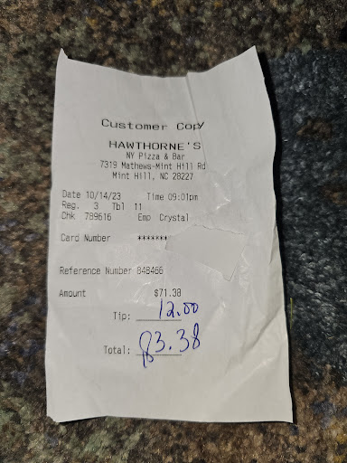 Just warning my local Mint Hill people and friends. If you've ever parked at Hawthorne's when the char bar parking lot is full, they will boot or tow your car. It cost us $450 to get my wife's car from a tow company tonight after eating. There is a large sign when you come into the front of Hawthorne's that says your car will be towed that I noticed on the way out. In the back there is a sign as well but not as bright and is bent, which is the way she came in (and likely the way anyone going to char bar would enter) so not nearly as visible. We noticed they have a spotter on the upper deck of the ladder at the back doing dispatch work to the tow company ready to call you in the moment you step out of your car. Keep in mind there were plenty of parking spaces. There were 3 cars with boots in them and ours had already been towed. On the phone the manager of Hawthorne's said it is the property manager who is organizing this but the towing company said Hawthorne's hired them, so I don't know. All I know is we don't get out much with special needs kids and Mint Hill has been one of the areas we go to as it is not too far of a drive from the house so that if our kids become unmanageable we are not far from base. I know I have many friends and family who live in or around Mint Hill who have likely done exactly what Emily did tonight, and I just want to make you all aware. I've been to Hawthorne's probably a hundred times since they opened. I've even parked at char bar to go to Hawthorne's. Obviously Hawthorne's has the right to tow anyone not using their parking lot for their business, I understand that, I just did not realize how aggressively they were enforcing this and I will not...