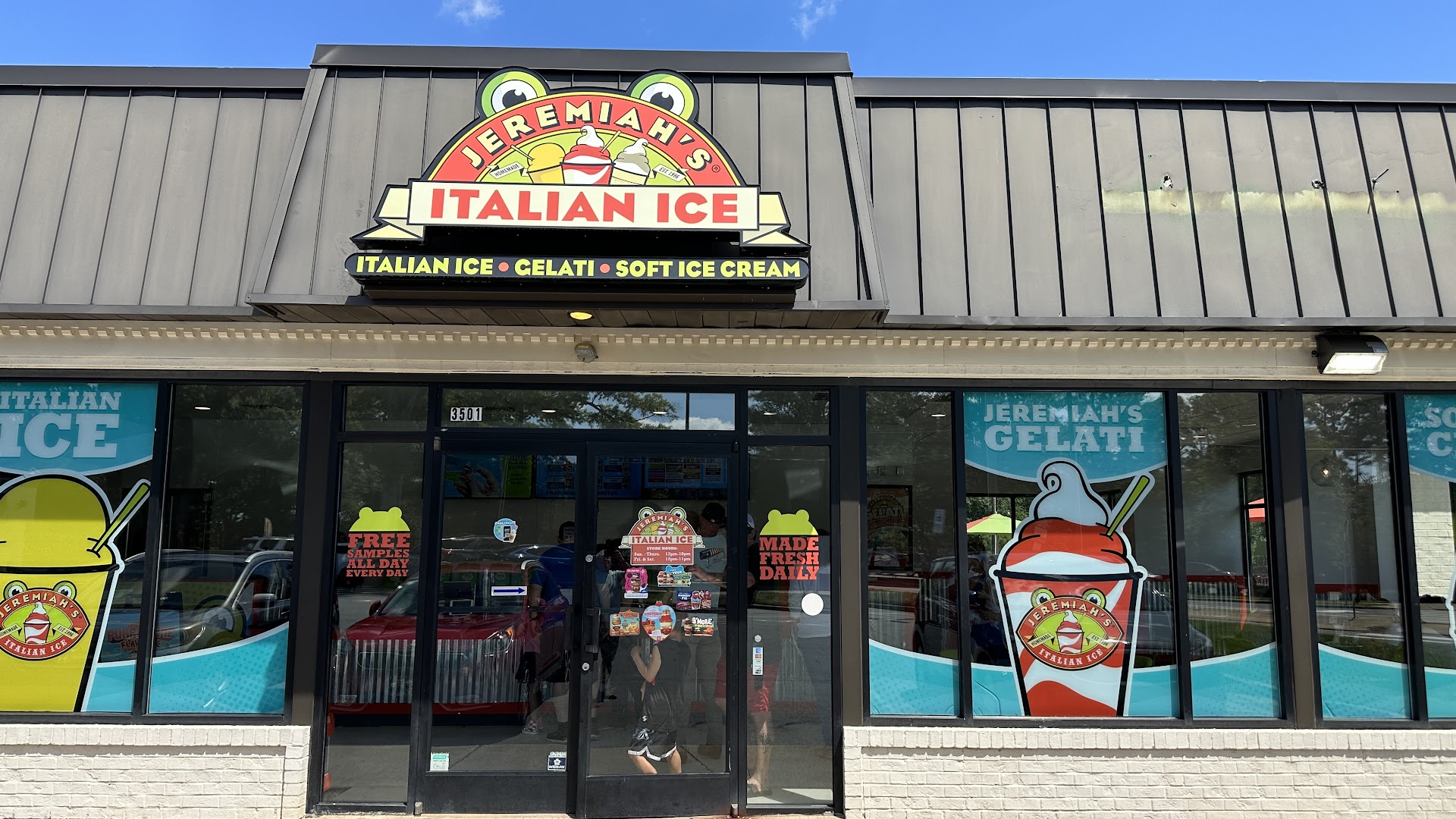 We absolutely love Jeremiah’s! Delicious flavors, normally fast service and a great time for everyone! HOWEVER- We’re very disappointed with our experience today. There were four or five workers and only one worker was doing in store orders. That means the one worker (who informed us it was their first week) was taking orders for a line outside the door while also making all of the gelati’s. In all of the time I have been a customer here, I have never experienced one person practically running the entire store, usually there are multiple people manning the front! 2 of the workers seemed preoccupied cleaning the bathroom instead of helping the line. (We saw them later up front after the rush was already gone.) I understand that call outs and under scheduling are inevitable, but it is the managers job to ensure issues such as this are taken care of, and I am disappointed that instead they put the workers in a stressful and difficult position. Additionally, when we went outside to sit and eat, the music was absolutely blasting and it was hard to hear eachother over the speakers. I suggest possibly turning it down just slightly! Hopefully, next time we come back, there will be a few more people scheduled! (Please give the person working the front today a raise they absolutely...