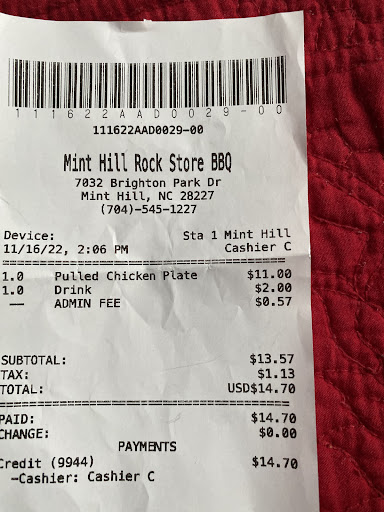Read moreI am very very fussy about my Bar B Que. It MUST be moist and flavorful before any sauce is added to it. I have always gotten the pork Bar B Que. It is always excellent. The sandwiches are simply stuffed with juicy moist meat. Generally if one orders a barbeque sandwich at a generic ( any place other than the Rock Store barbeque restaurant), the sauce is bad enough to ruin the sandwich. It is not that way at the Rock Store Bar B Que . It took me a few visits before I would trust them enough to allow them to give me a container of sauce . They have 3 kinds of sauce to choose from. They allow you to taste a sample so you may choose if you are unsure. Their mustard sauce is now my favorite . It is given to you in a separate container. There is only 1 negative thing I could ever say about them. Don't waste your time with any of their sugary desserts in the front counter ( these are the ones that you pick out yourself and eat with your hands) . Those desserts are nowhere near the same elite category of which their bar-b-que is in. See 2015 update below: