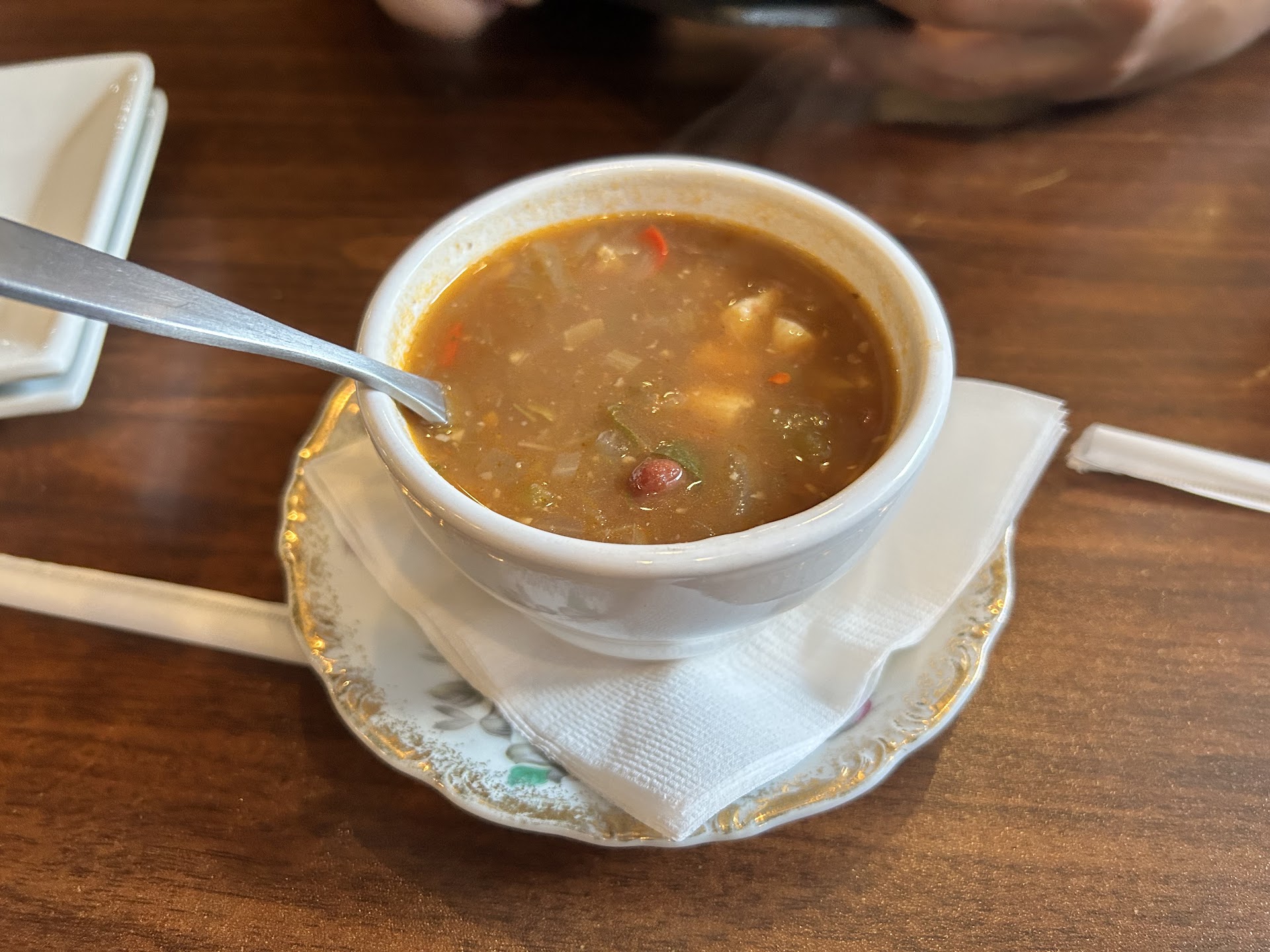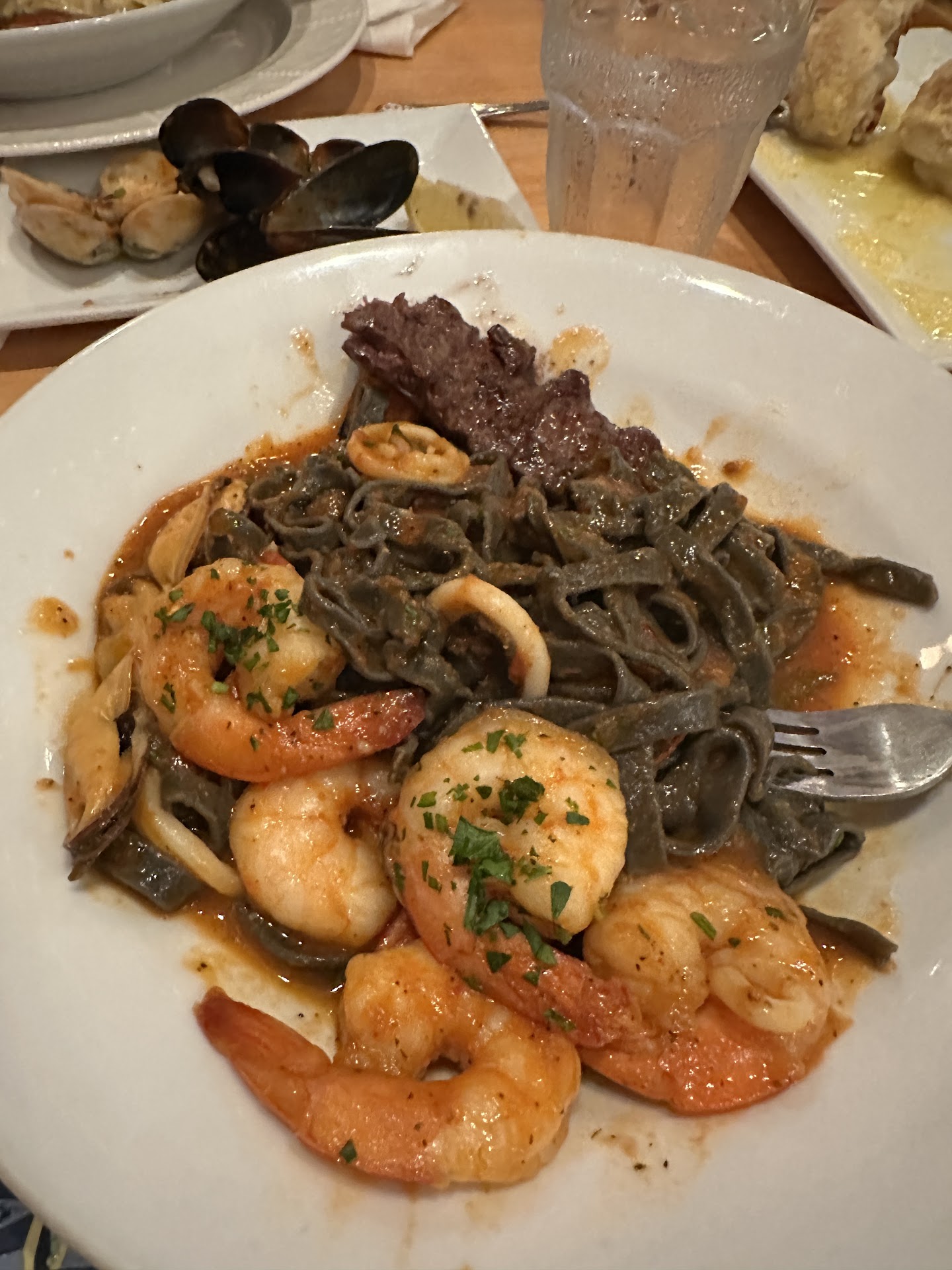 We started with a salad appetizer (large enough to share), and soup was included with the entrees. For mains, we ordered two pasta dishes. I had the pasta alla ruota (which is kind of trendy these days), which they finish tableside by swirling fresh pasta in a glorious cheese wheel. The pasta was homemade, cooked just right, and perfectly coated in rich, melty goodness.