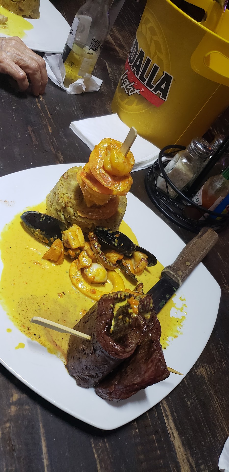Read moreHubby and I had been wanting to try this restaurant for a while. I can truly say that I will never go back. First, the service was horrible. The hostess sat us down and the waitress didn't come to check on us until 20 minutes later. We ordered a bucket of beer, a chicharron appetizer, and a glass of water with lemon. We got the beer and placed our dinner order. Hubby got the Mar y Tierra for $35, mom got the pargo a la criolla for $25, and I got the chimi sliders for $16. The chicharron appetizer came out and was placed on our table. We had NO silverware and no plates. Meanwhile the waitress was MIA. I had to get up from my table to go look for her to ask for silverware and napkins. After a while we got our food order. I had to ask for the water again since she had forgotten about it. The Mar y Tierra was very good. It was the best meal of the night. My mom's fish was a joke. She didn't even get a whole fillet. It was broken into pieces. The flavor was also very fishy. I wanted to send it back but she refused as she was afraid of retaliation from the kitchen. The mofongo was also very dry and was not served with a broth to dip it into. Ughhh After almost 20 minutes my sliders finally came out (just as I was about to cancel them). The sliders were horrible. The meat was overcooked and did not taste good. The toston portion was drenched in oil, as is the oil they were cooked in was not hot enough. Overall this restaurant experience was negative for me, aside from the Mar & Tierra, which I say again was very good. The service was slow and inattentive. Plus, the restaurant itself was so noisy. I do not recommend this...