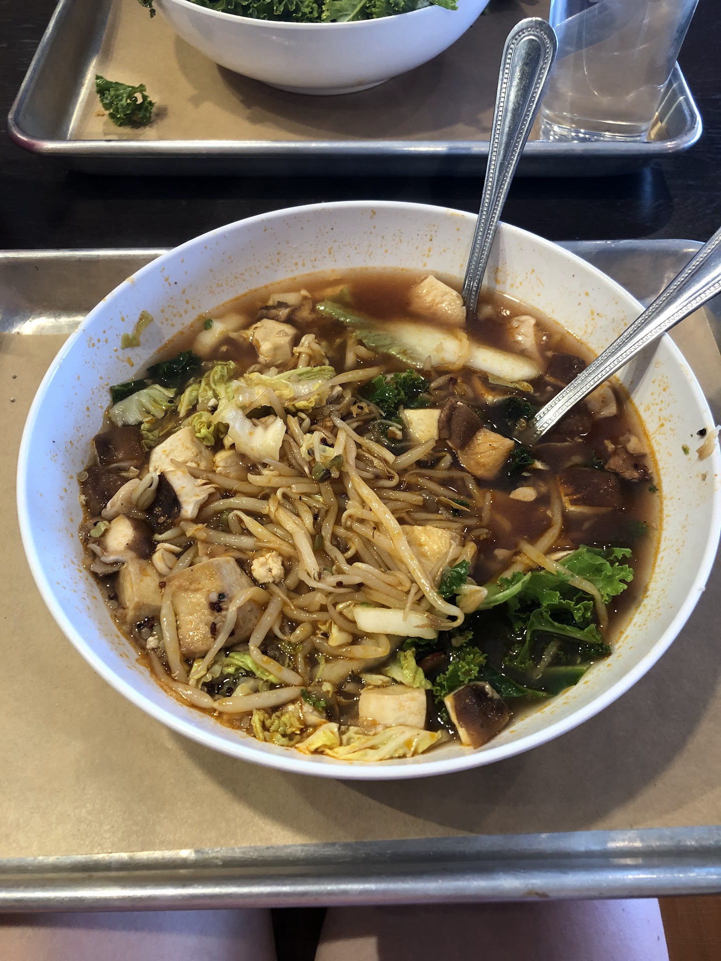 Corelife Eatery has a huge menu selection so people enjoying different types of diets will have no trouble finding just the right meal for them. I found a vegan broth bowl with shiitake mushrooms and tofu. My boyfriend ordered a kale salad with, I think, a carrot ginger dressing. The broth bowl didnāt come with any grains, but when I asked them to add some quinoa to make it more hearty, it was no problem.