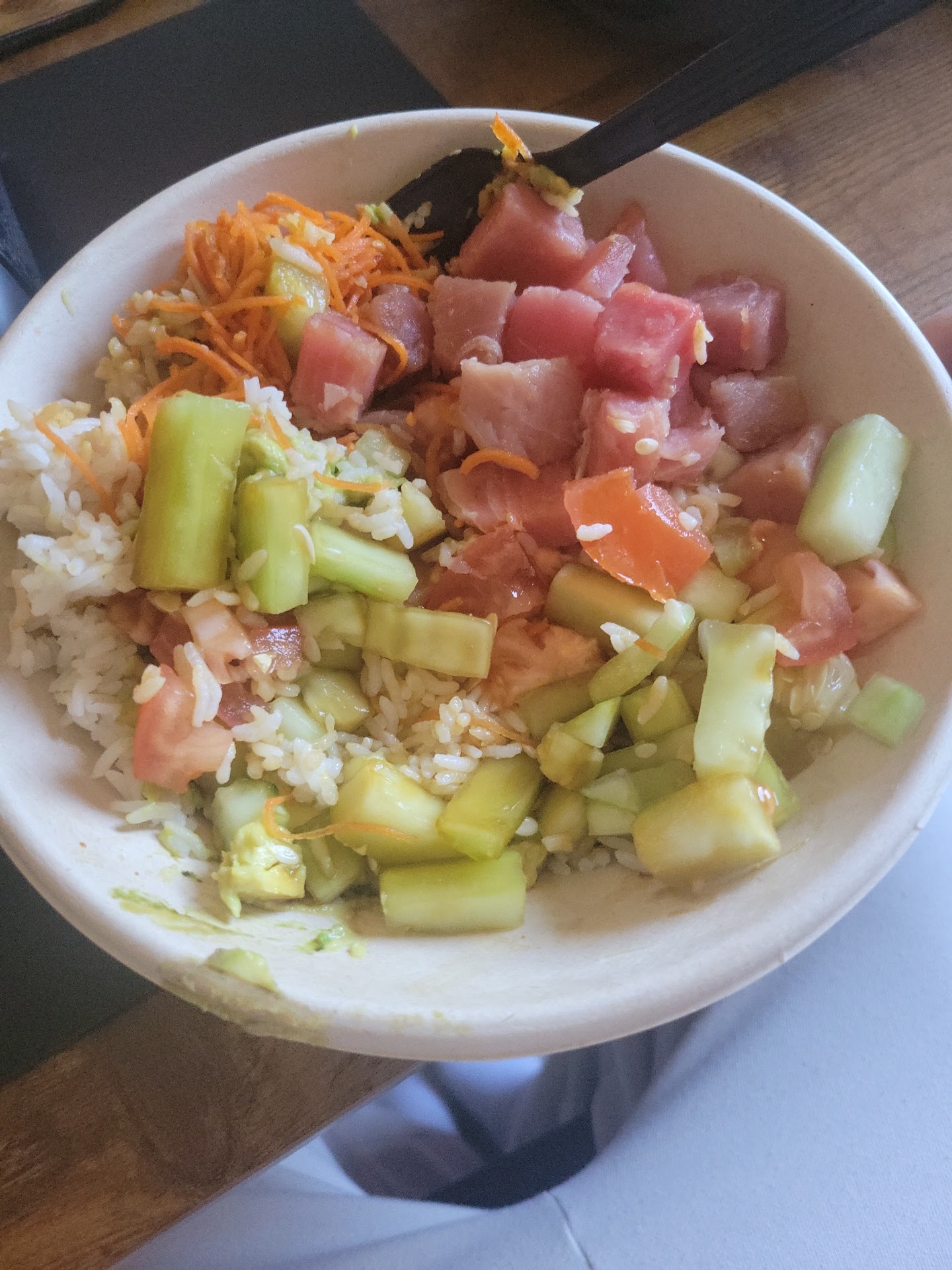 Read moreFood is outstanding! It was my first visit to this location. It will not be my last! I was a little overwhelmed with which way to try the new-to-me location. Piecing together a dish or a signature bowl. I decided that a fair trial is made by allowing the establishment to make a recommendation. So, signature bowl It was. I ordered the Hawaii Poké bowl. It has a variety of proteins. I chose white rice, no lettuce as the base. When served, it was a giant specialty sushi minus some seaweed. Absolutely wonderful! I should have stopped eating halfway through the dish. I told myself to take the rest home. I was full. . . . I also finished the entire portion. .my one mistake. A pleasant one, but still a mistake. At basically $20 for the dish, it was not over priced. Again, next time I might convince myself to make it two meals. Maybe not. I has water to drink, but that is my normal beverage. I was hot and a little dehydrated. Other options are available. Service was pleasant and timely. Nothing fancy, but exactly what I wanted. Simple eating atmosphere. Not high dining. No complaints, just an observation. Dining area is sufficient for...