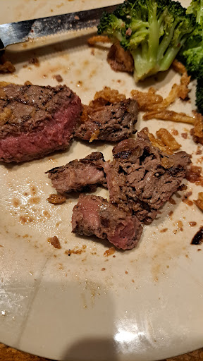 Immediately attempting to cut into mine was impossible. A giant strip of tough tendon ran up the side that I couldn't even cut with the steak knife. The Mac and cheese tasted burnt and old. The only saving grace was the broccoli. We sent the steak back and they replaced it with a better cut, however it still had a decent amount of tough tendon I had to cut away, and it was cooked medium rare instead of medium. Whatever, I was starving, so I ate what I could and took the rest of edible meat home.