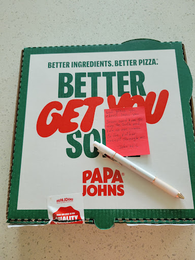 Read moreArrived and went into store when app said order was ready, only to find out my order was not ready. After standing in the store for ten minutes with four other people waiting. My name was called and I was handed my order. After arriving home and going to eat we noticed one of the pizzas were wrong, and we were missing extra sauces. With people already hungry we decided to eat it anyway as it was late in the night. After contacting "Toni", they explained it was our responsibility to bring the wrong items back to the store so they could remake it, as I didn't check to make sure I was handed the correct things. Make sure to avoid MY mistake and check everything before...