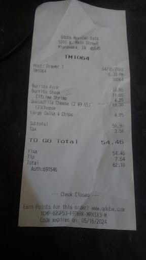 Read moreIf I could give this 0 stars I would. My family and I drove 9 hours to South Bend today and were tired and hungry with 6 of us, eager to eat an awesome meal. We LOVE Qdoba but where we live now there aren't any. So that was what we wanted first on our vacation after a long day. My 2 kids walk in at 8 pm (they close at 10 by the way) and the first thing we hear is a lady shouting that there's no more fajita or shrimp. I was the first to order and ordered a steak quest burrito. The guy hardly put any rice in to begin with... then there were no more pinto beans. The staff then complained they had to go get more and the lady behind the counter grudgingly was convinced by the other 2 to grab it. Then there was no more steak, no more queso... the counter was disgusting and most of the food dishes on the line were empty or filled with nasty old water. The staff thought it was hilarious how much they were complaining and how little they cared about their jobs. We crossed town to get this food and were shown such disrespect. I told them finally forget it. And we left and we convinced the girl behind us to go to. That place is a salmonella poisoning waiting to happen. Then I decide to come write this review and I see on here hundreds of people complaining of exactly the same things. Don't bother commenting back Qdoba franchise unless you plan to actually fire those stooges and get some management replacement in this disgusting place. How awful that for years people have been ripping you apart and receiving horrid service at a franchise restaurant and you have not done anything about it. That's shameful. I will never set foot in a qdoba again after tonight. Just absolutely a game changer. Never ever eat here if you value your dignity as a customer or...