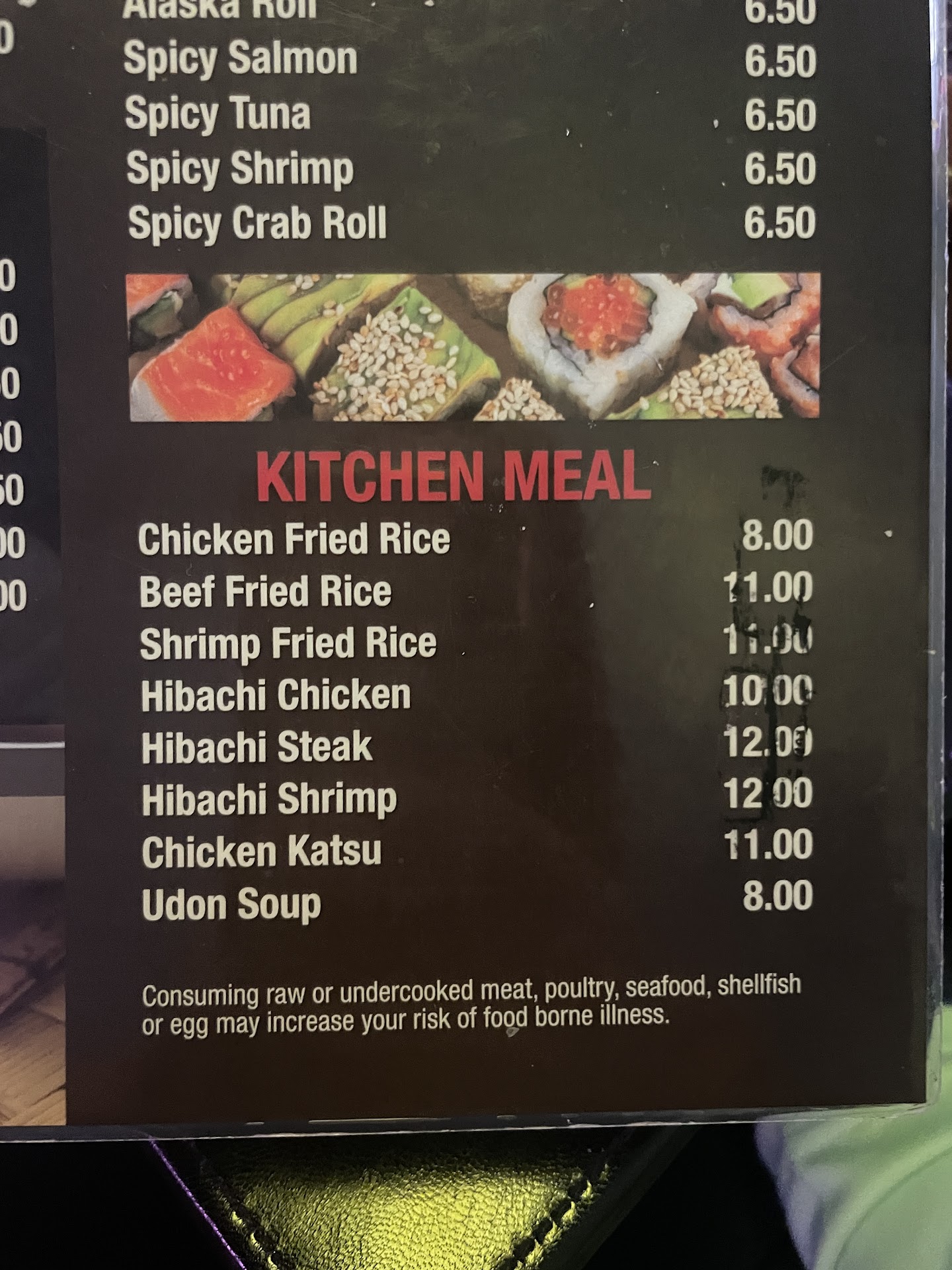 Read moreIf I could give our visit 0 stars I would. First off, I contacted them 10 days prior to our visit to make a reservation for a party of 13. They took my name, number and asked us to all arrive 15min early. We arrived and they "forgot" our reservation.. Second, the staffing is terrible. I give props to the waitress as she was the only one in the whole restaurant, full of customers, to wait on anyone. Third, they brought us our bill and we noticed that our hibatchi meals were priced far more than the price listed on the menu that was handed to us. What should have been a $12 hibatchi meal (as listed on menu) was suddenly a $20 meal. This is a large amount difference for a family of 5. When this was brought to the owners attention, he chalked it up to "those menu prices are outdated." What?!? Why would you provide a menu to a customer with incorrect pricing and then charge them more than the listed price. Sounds like a scam to me! He bluntly repeated his self and refused to honor the pricing listed on the menu. My family & I were frequents of this restaurant, but after the poor customer service we received tonight, we will not be back! So just a warning, if you chose to eat at this restaurant, plan ahead for your bill to be significantly more...