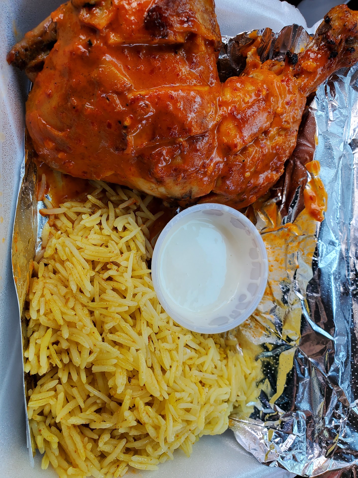 The person at the register acted as if he would rather die than help me. I was so uncomfortable that I nearly walked out without ordering. I had never been there before so I asked for just a moment to look at the menu and he let out an annoyed sigh and slumped where he stood. He was reluctant to answer my questions and when he spoke to me it was in a short and impatient manner. I ordered and stepped aside to wait and it was longer than expected. The rice I ordered was lacking something, a freshness perhaps, had a very flat spice flavor (clove only? cumin only?), was slightly undercooked, and some bites were a bit crunchy. The chicken was tasty and the spicy sauce was yummy. The price was much higher than expected because I had a printed menu (which they still were giving out in store) from pre-pandemic times and the prices were lower then, but you wouldn't know that until you went in the restaurant.