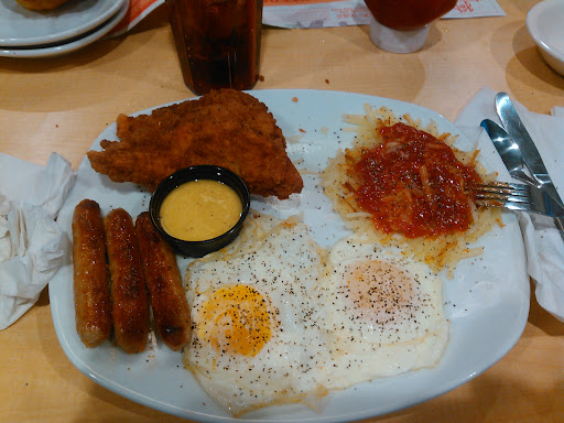The food takes forever to come out and it made one of our party very sick right afterwards. The eggs were bad. And the food was very dry. We had to request many things as the waitress walked by since never brought them out with our food- ketchup for our fries, syrup for our pancakes, etc. When we left, a table next to us had finally gotten their drinks after a 15 min wait and were unhappy as we were. The worst part was the restaurant was not even busy, there were only 5 tables with people at them. Will go elsewhere when wanting...